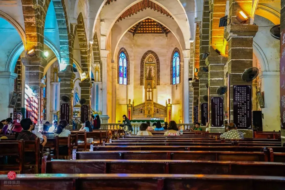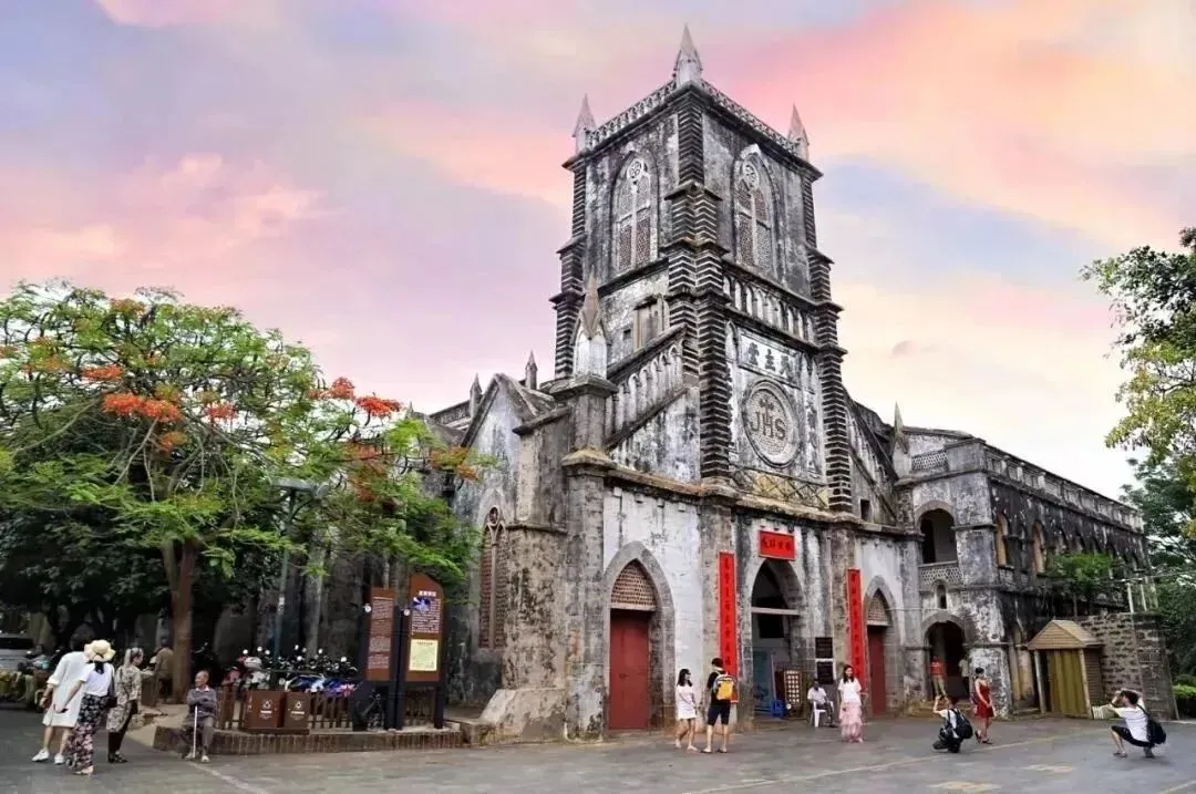 藏在盛塘村,1853年由法国巴黎外方传教士历时十年建成,用岛上的珊瑚石、火山石砌筑,糯米、鸡蛋清和红糖做粘合剂,是典型的哥特式建筑,复古复古韵味拉满,往那儿一站,自带欧洲滤镜。