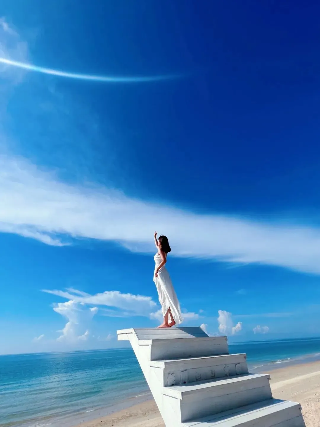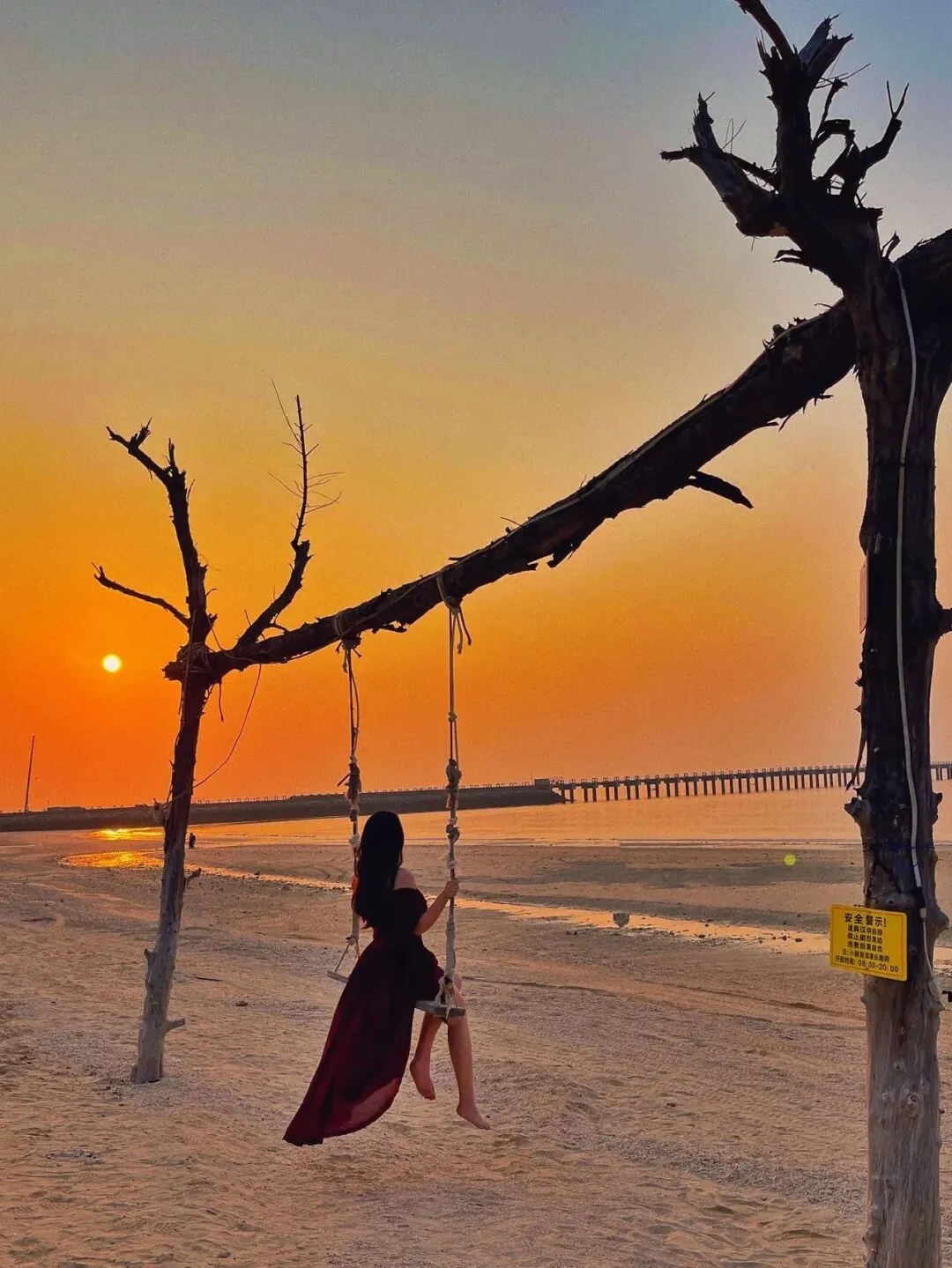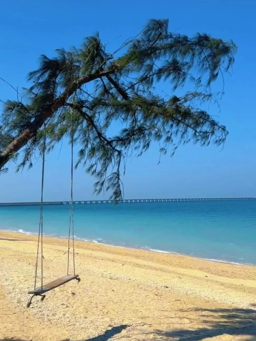 在桥边的海滩远眺,或打卡涠壹海景木屋前的网红秋千、走上长风咖啡门前的天梯,玻璃海作背景,和晚霞合张影,不用刻意找角度,自带度假风情。