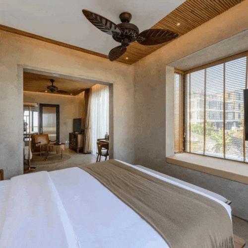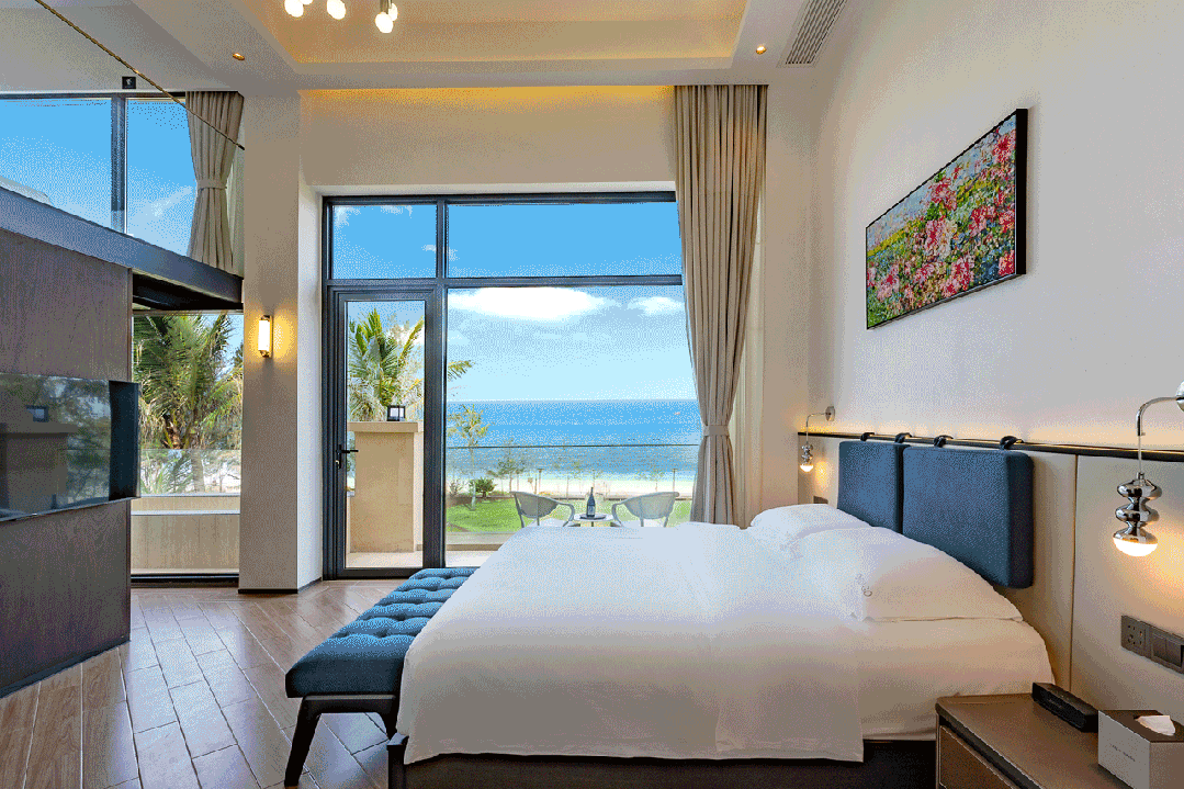 若追求看海的轻奢享受,豪华套房绝对是首选。36㎡的超大空间通透开阔,自带独立海景阳台,搭配柔软大床、休闲沙发和度假躺椅,可容纳2大1小入住,全家围坐便能将无垠海景尽收眼底。