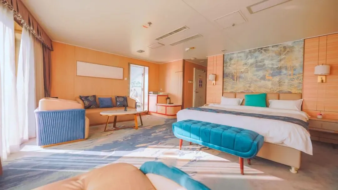 游轮房型多样适配度假需求,涵盖豪华套房、双床阳台房及舷窗四人房,每一间都宽敞舒适、配套齐全,总能找到一款让你“躺平”看海!