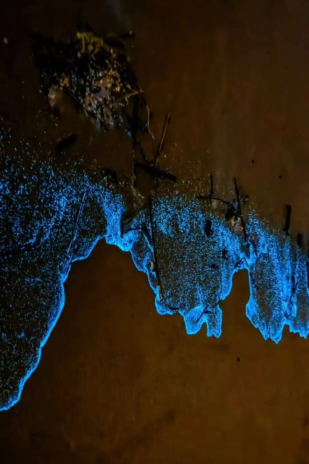 这是海里夜光藻聚集的魔法,它们受到海浪拍打,体内的荧光素和氧气反应,发出绚丽的蓝色光芒。