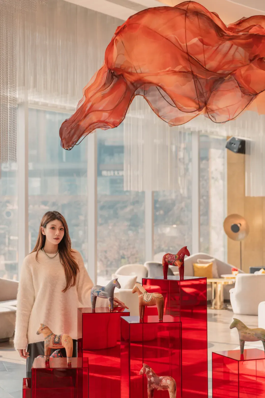 展览落地酒店潮堂,核心是半空纱棉材质的火马头装置,尽显现代中国艺术风格;红色亚克力高台马展陈列着Icy Tan、张菀垠、谢子渊等先锋艺术家的创意马作品,各作品承载美好期许,呼应火马年内核。同时展览推出原创手绘实物展售活动,让艺术从观赏延伸至收藏,真正走进日常生活。