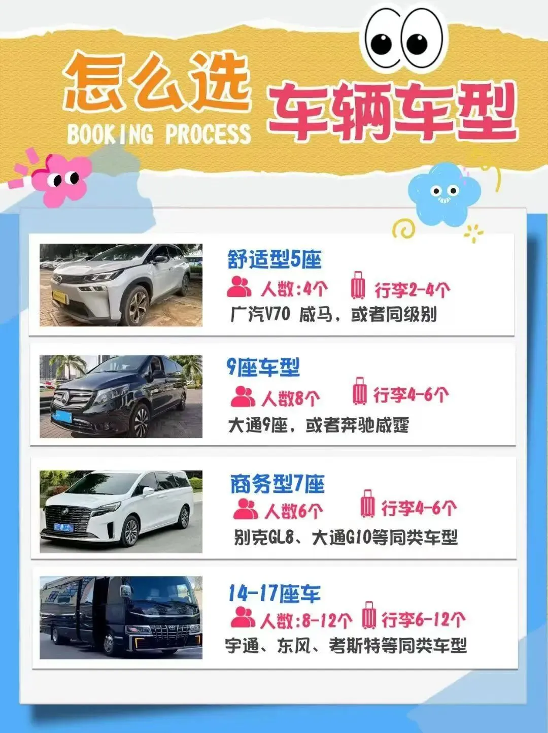 ✅所有车辆均为配驾包车,司机熟悉路线,服务贴心!🧭二、怎么选车型?看人数+行李数!适合人数 行李数量 推荐车型4人 2-4个 舒适型5座(广汽V70/威马)6人 4-6个 商务型7座(别克GL8/大通G10)8人 4-6个 9座车型(大通/威霆)8-12人 6-12个 14-17座车(宇通/考斯特)