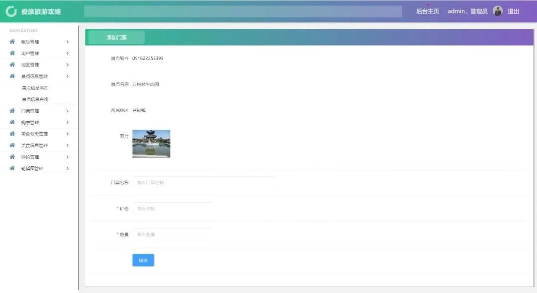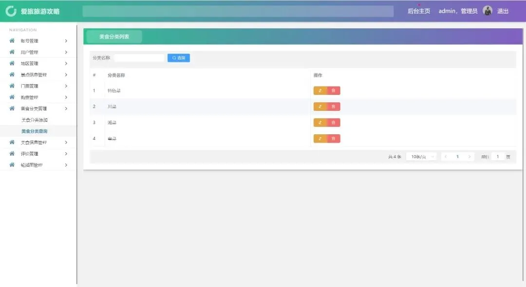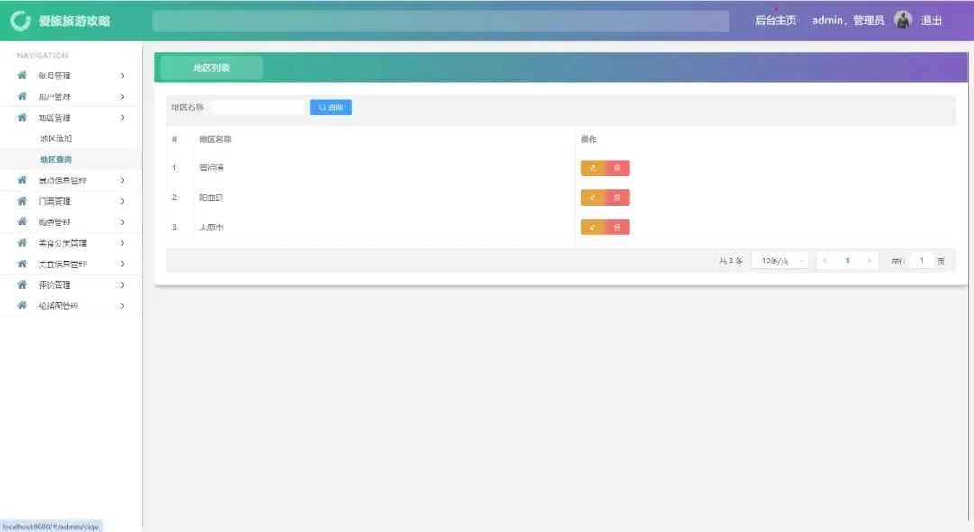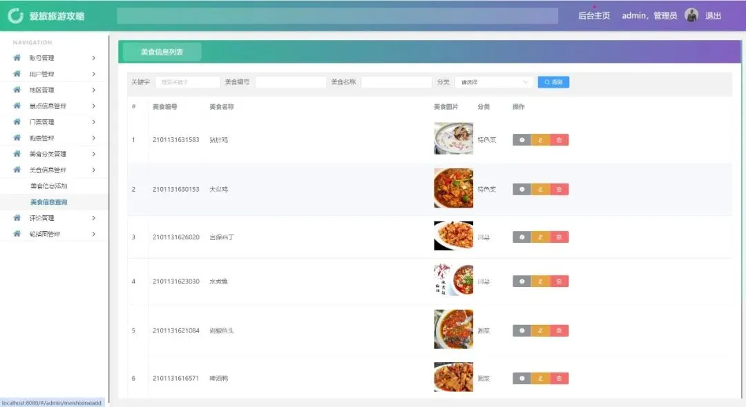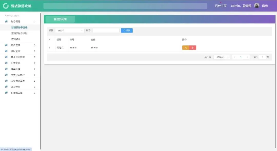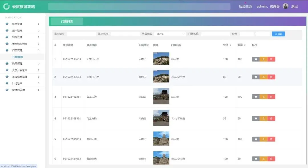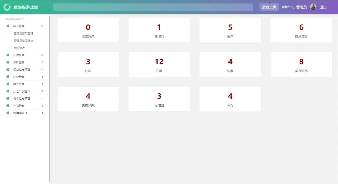 账号管理、用户管理、地区管理、景点信息管理、门票管理、购票管理、美食分类管理、美食信息管理、评论管理、轮播图管理、密码修改、个人信息