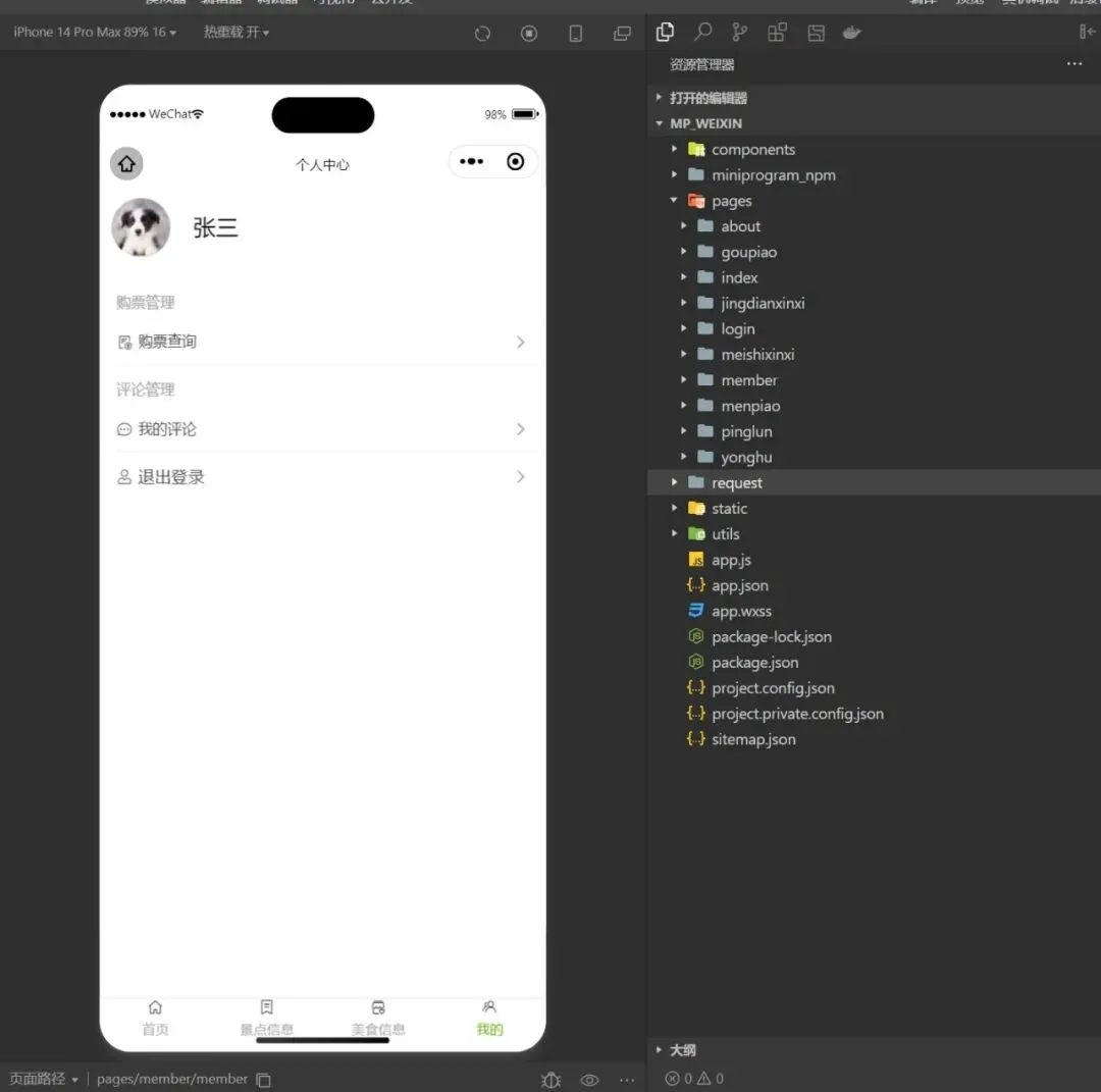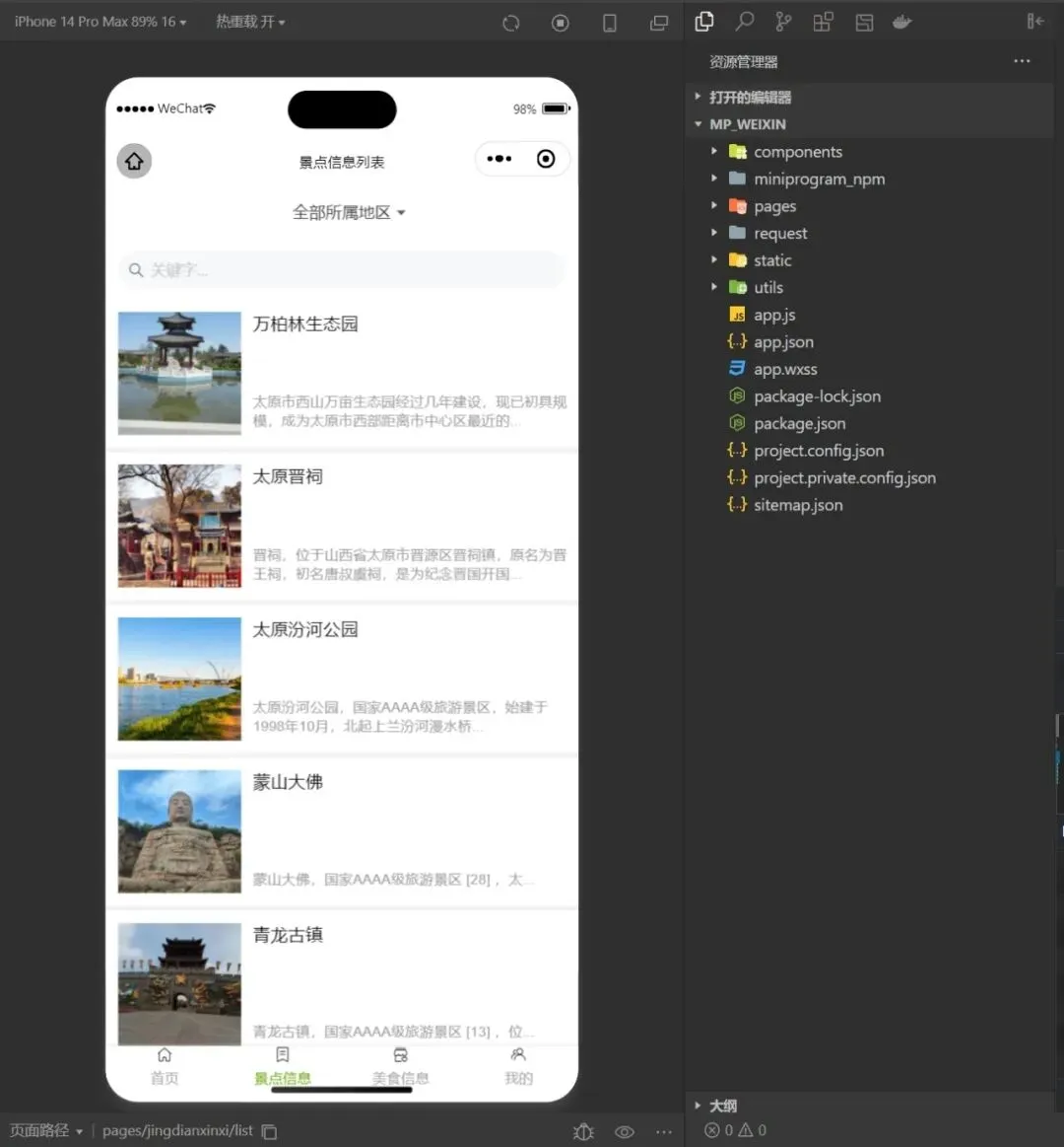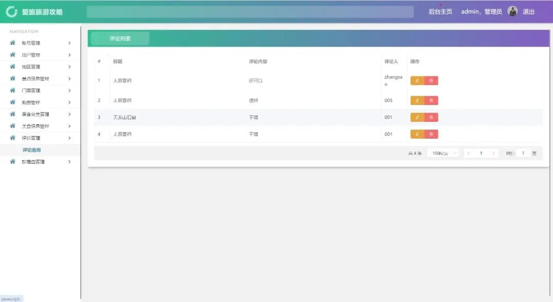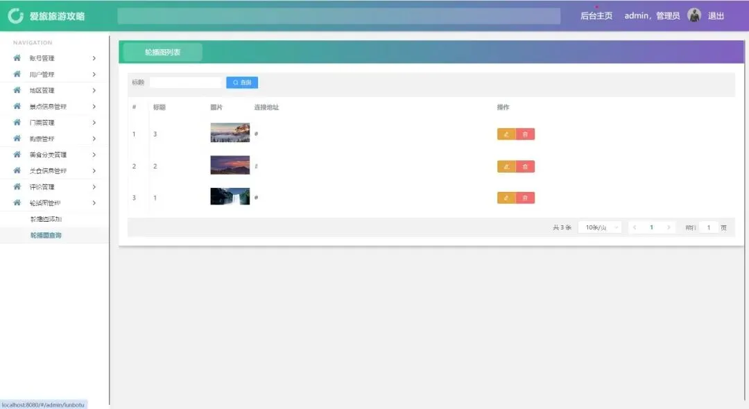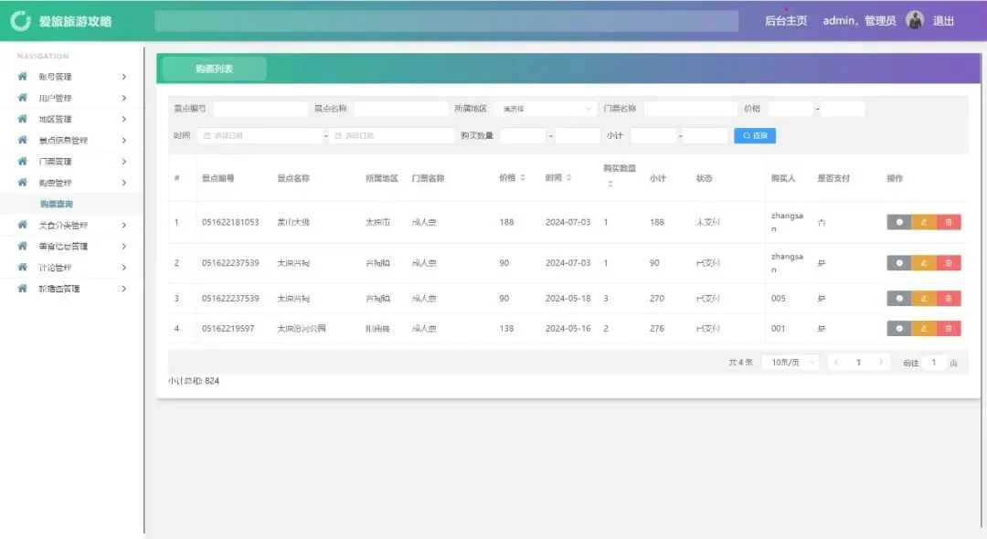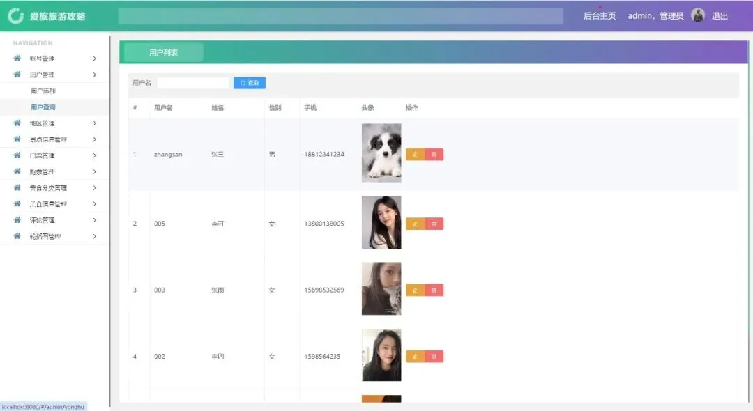账号管理、用户管理、地区管理、景点信息管理、门票管理、购票管理、美食分类管理、美食信息管理、评论管理、轮播图管理、密码修改、个人信息