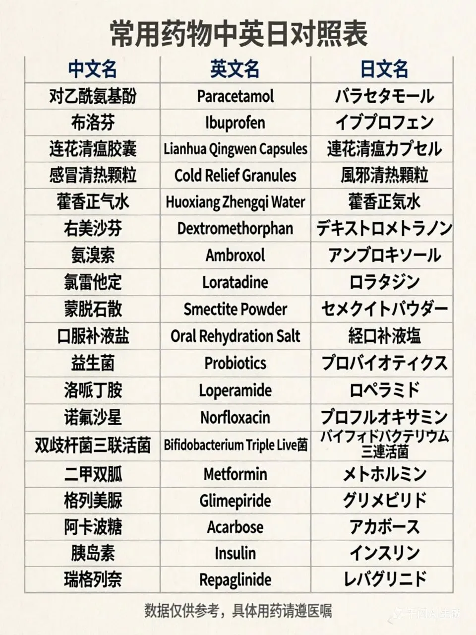在国外药店,如果你无法准确描述病情,这张表就是你的“通关密码”。我们特别加入了日语,方便大家去日本康养旅游时使用。