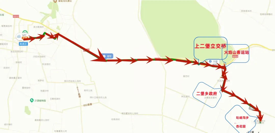 方案1:吐鲁番市(沿G312)——二堡立交桥——二堡乡政府——吐峪沟乡杏花园。