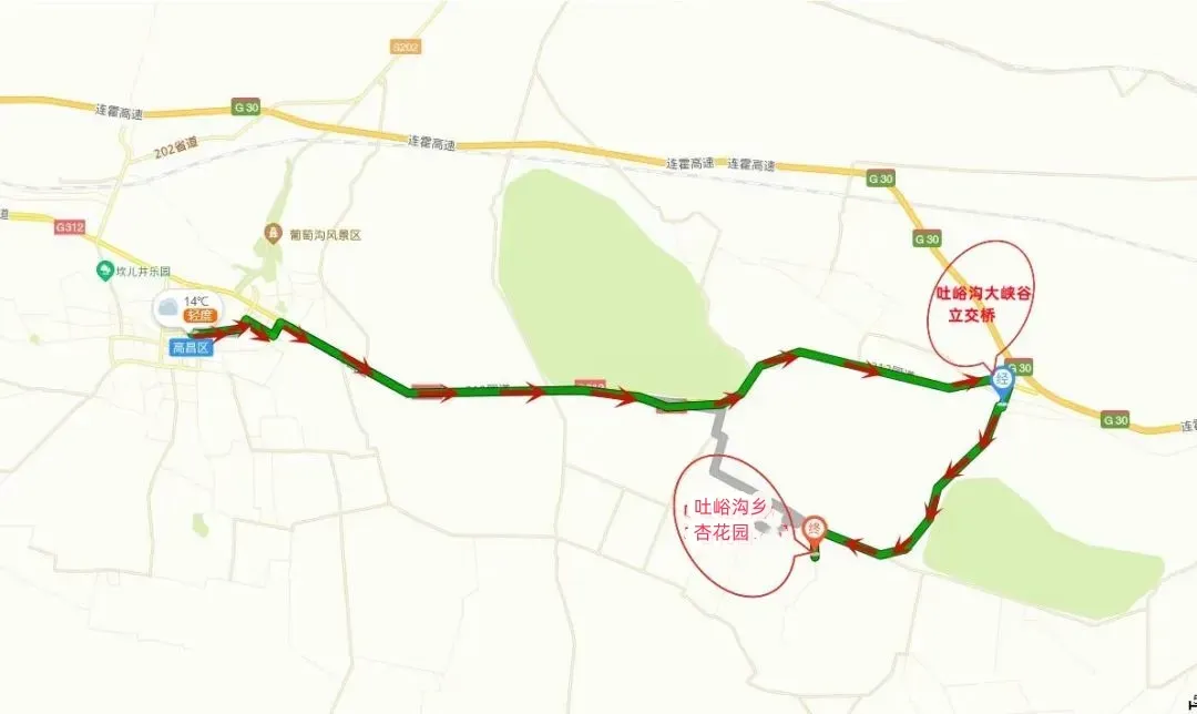 方案2:吐鲁番市(沿G312)——吐峪沟乡大峡谷立交桥——县道X065线(吐峪沟大峡谷路段)——吐峪沟乡杏花园。