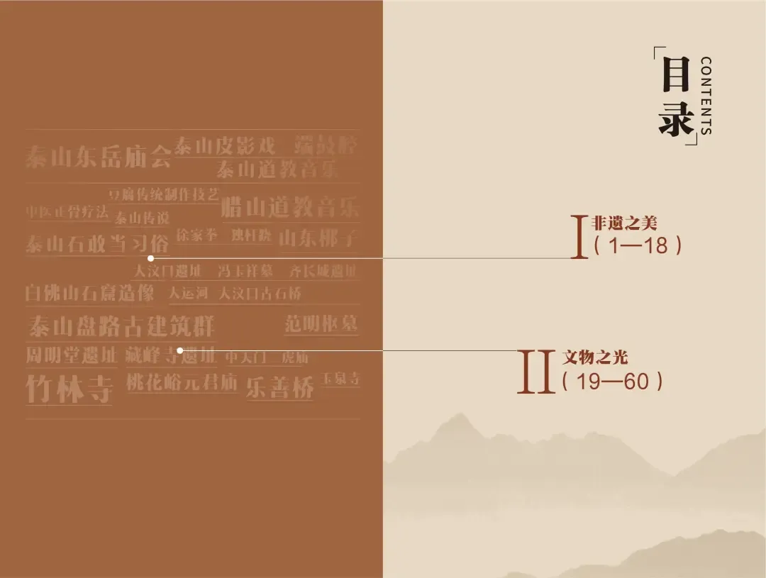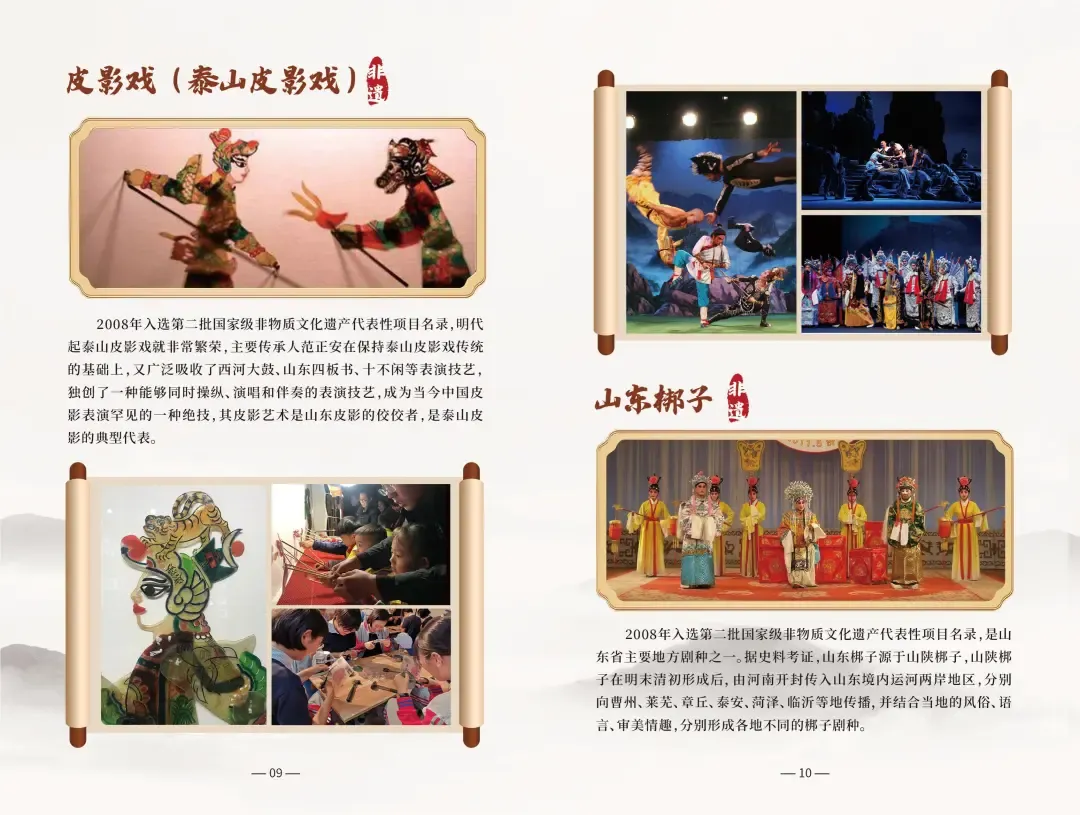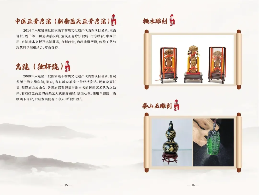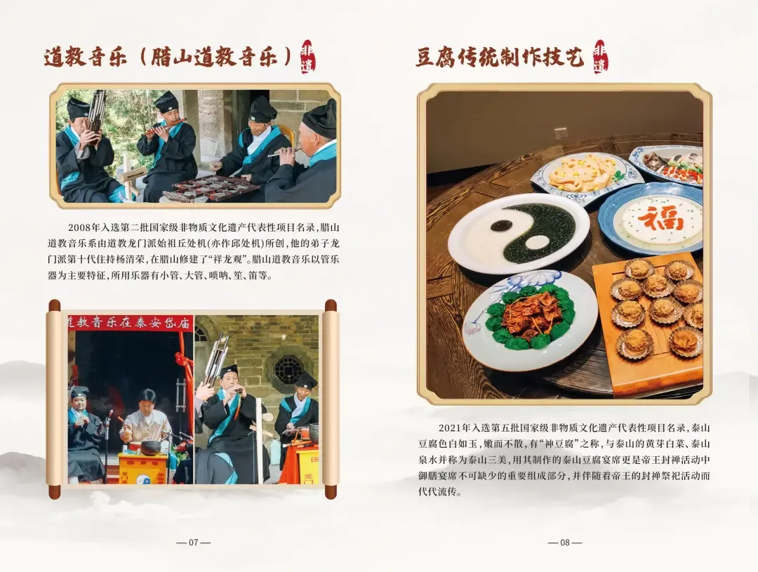 泰安这片土地上不仅系着名扬天下的五岳独尊,还承载着丰富的历史、文化和民族特色。浓厚的民俗宗教文化--泰山东岳庙会、泰山传说、泰山石敢当遗俗,凝聚天地万物、日月精华的道教音乐,雕刻精美的泰山皮影,以奇妙精湛的演出技巧,委婉优美的音乐唱腔,在众多的皮影流派中一枝独秀。历代皇帝们最爱吃的豆腐,一轮磨上流琼液,百沸汤中滚雪花;一把优质黄豆加一瓢泰山泉水,采用手工石磨工艺,方成地道的泰山豆腐,色白如玉,嫩而不散,久煮不老。