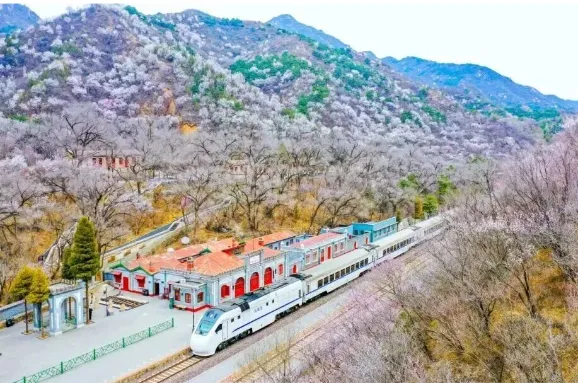 市郊铁路S2线穿行山谷,白色列车与漫山山桃、杏花相遇,一路粉黛如烟、云蒸霞蔚。窗外是层层叠叠的花海,远处是蜿蜒雄阔的长城,风里带着草木与花香,藏着春日温柔的诗意。