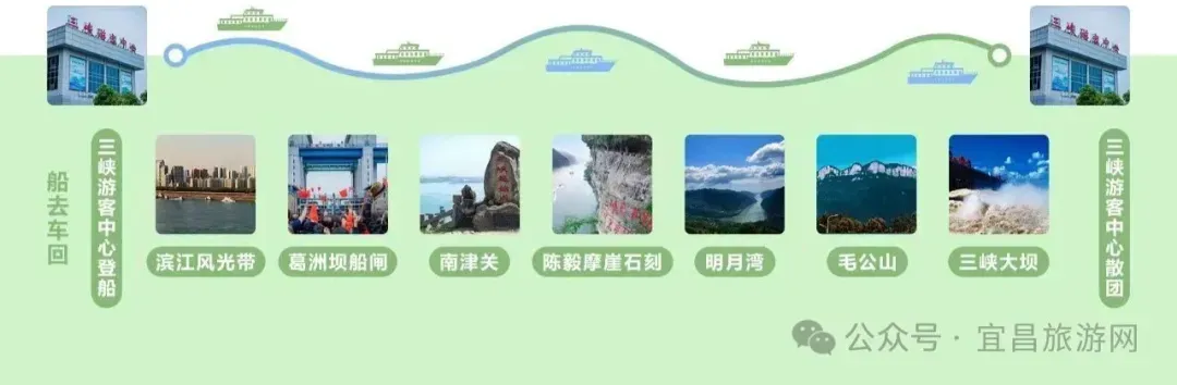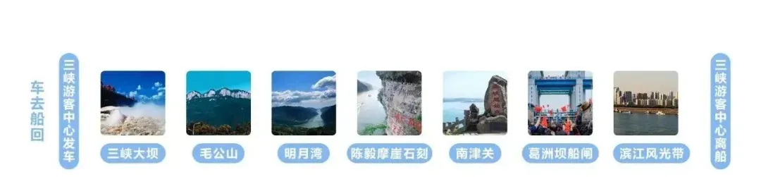 7:30 登车(宜昌均瑶广场7:30,三峡游客中心7:40,宜昌东站8:30免费接送)