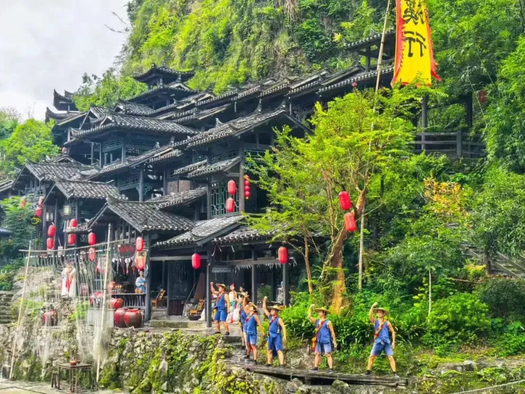 10:10- 14:30:下船游览山上人家(石令牌、 巴王宫、茶盐古道非遗传承一条街、 巴王寨 , 三棵树广场观看演出)。自理中餐后游览龙津溪(龙溪桥、鹊桥登、14:30 婚嫁楼表演、峡江号子、 迎宾表演)。