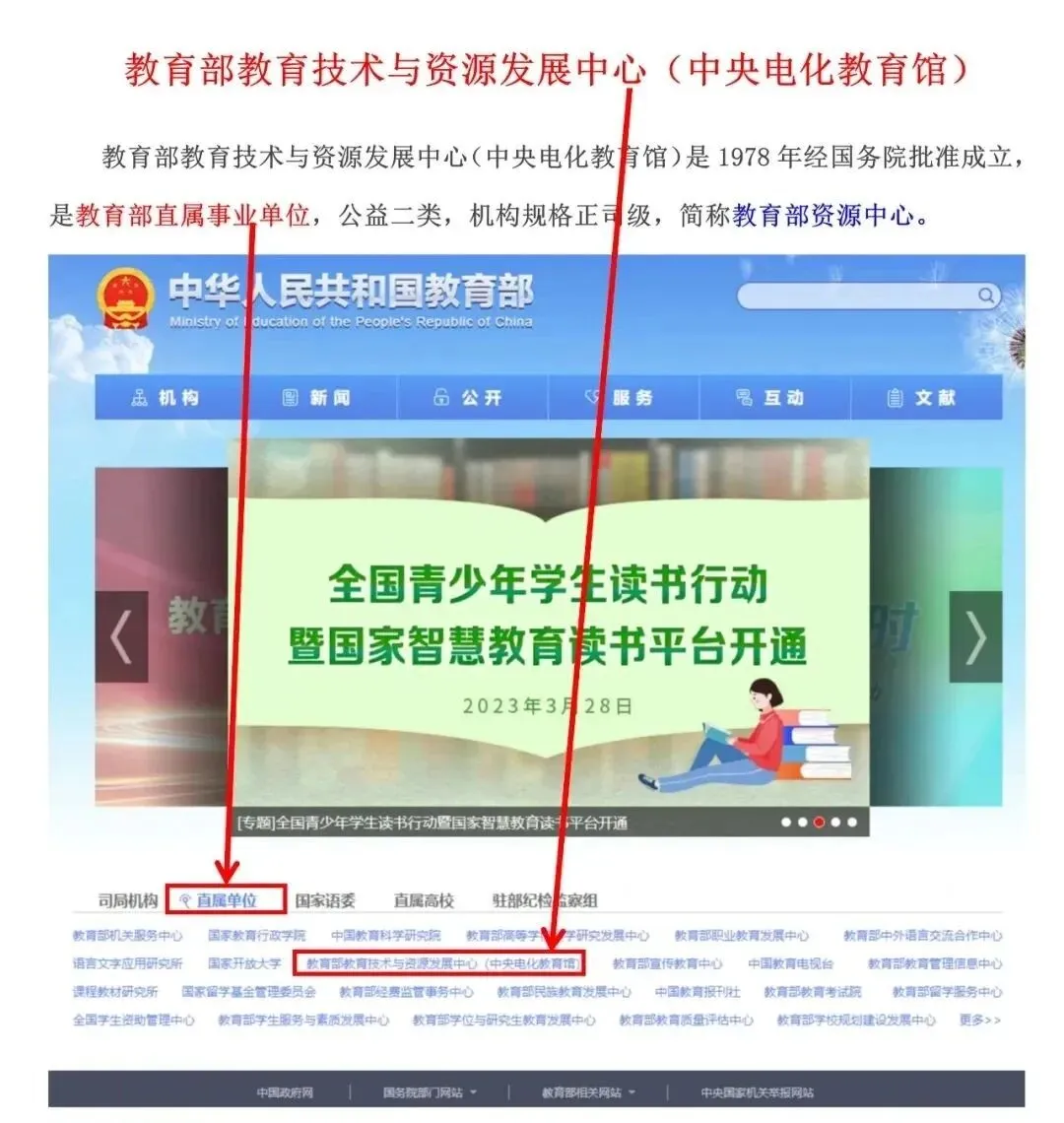 教育部技术与资源发展中心(中央电化教育馆)是教育部直属的以基础教育和职业教育服务的教育技术事业单位。其主要职责:开发多种媒体教材,开展多种媒体教材的研究、交流和服务工作;开发教育教学资源,建设教育教学信息资源;承担中小学现代远程教育工程项目的人员培训,资源的整合、集成、发送,科研支撑与应用指导,技术支持与服务等工作。