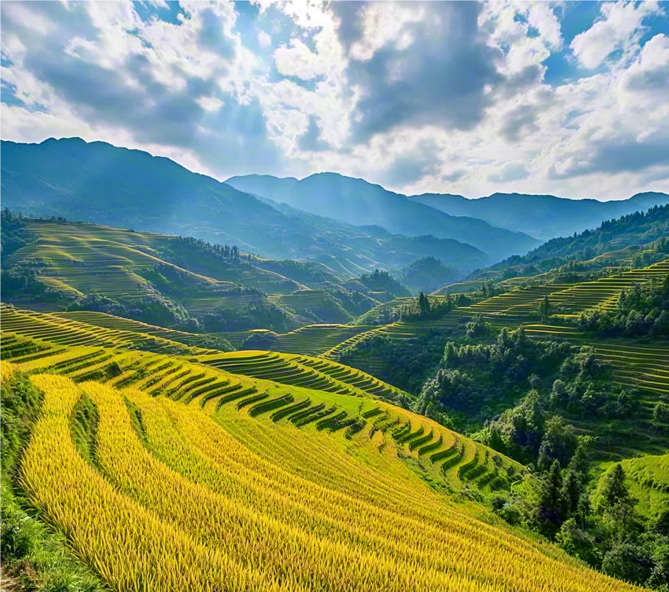 这段时间,水稻慢慢成熟,从黄绿交织变成满山金黄,层层稻浪如绸带缠绕山峦,微风拂过,稻穗翻滚,视觉冲击特别强。