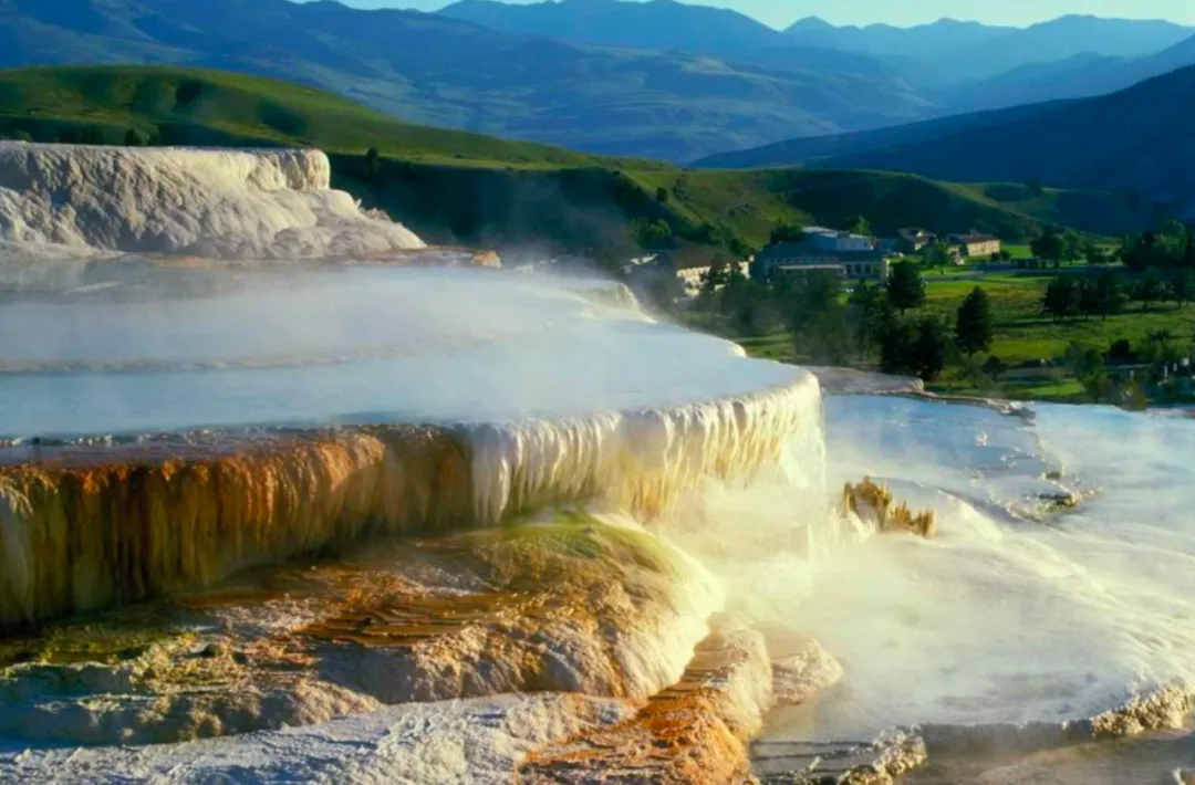 猛犸象热温泉是世界上已探明的最大的碳酸盐沉积温泉。沉积岩色彩斑斓,看上去滋润顺滑,如冰雪般通透