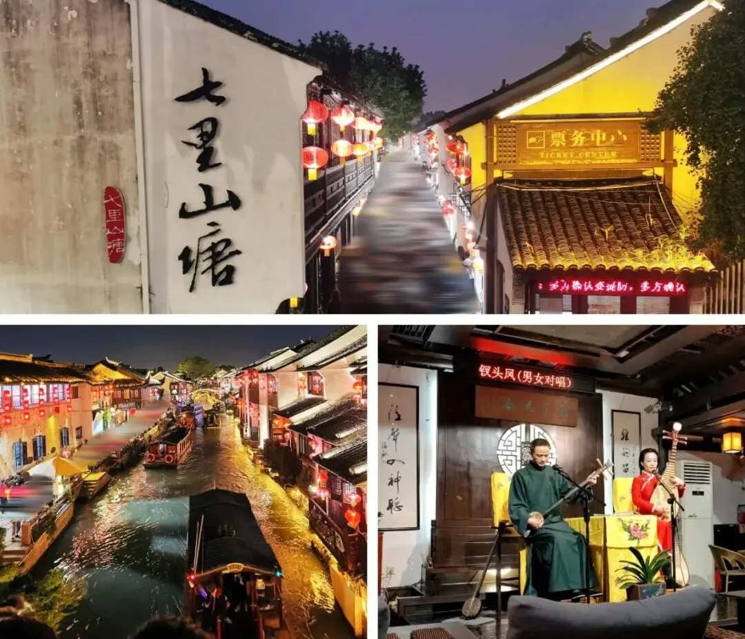 在住处用过晚餐后,夜游七里山塘街。古运河畔灯火阑珊,乘画舫穿行于小桥流水间,两岸白墙黛瓦挂满红灯笼,听一曲评弹,沉浸在水乡夜色中。