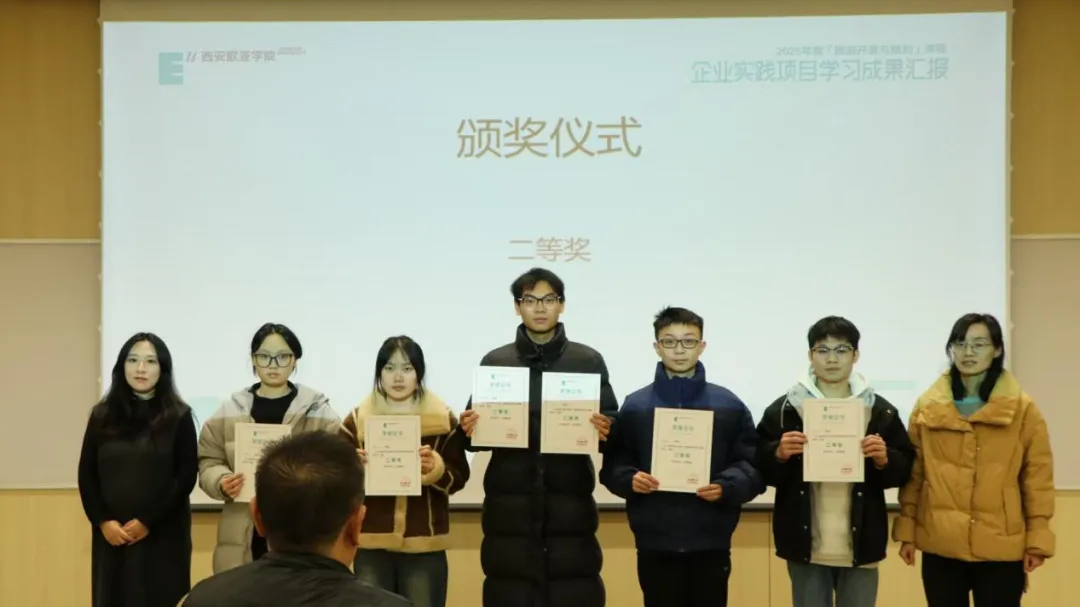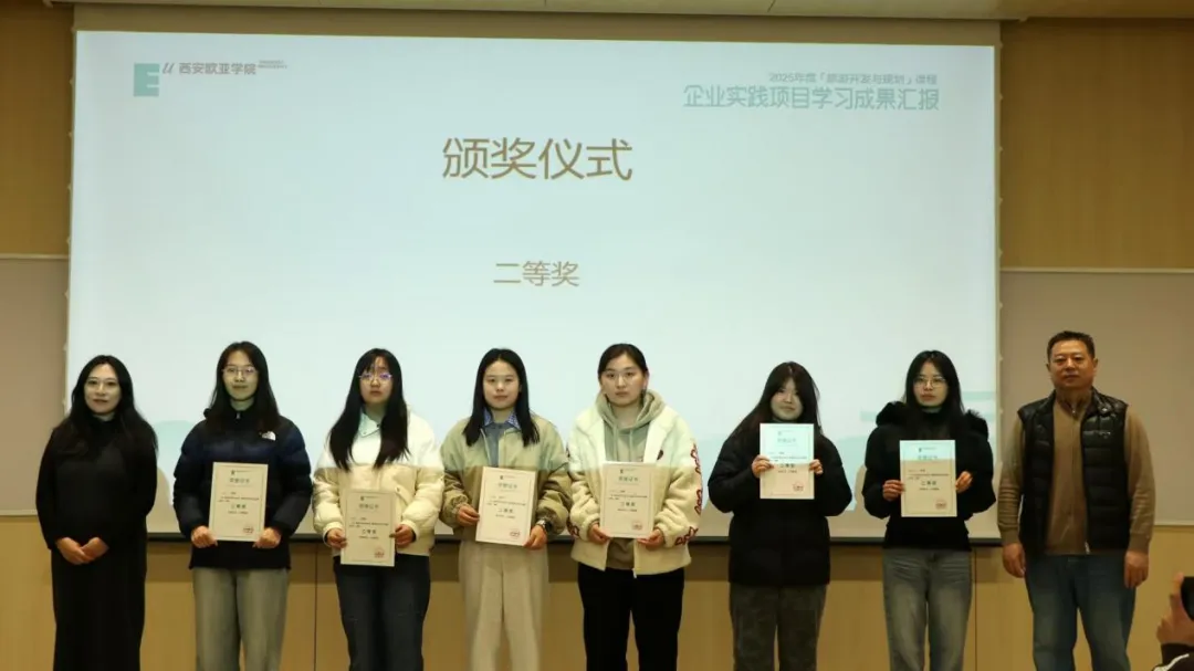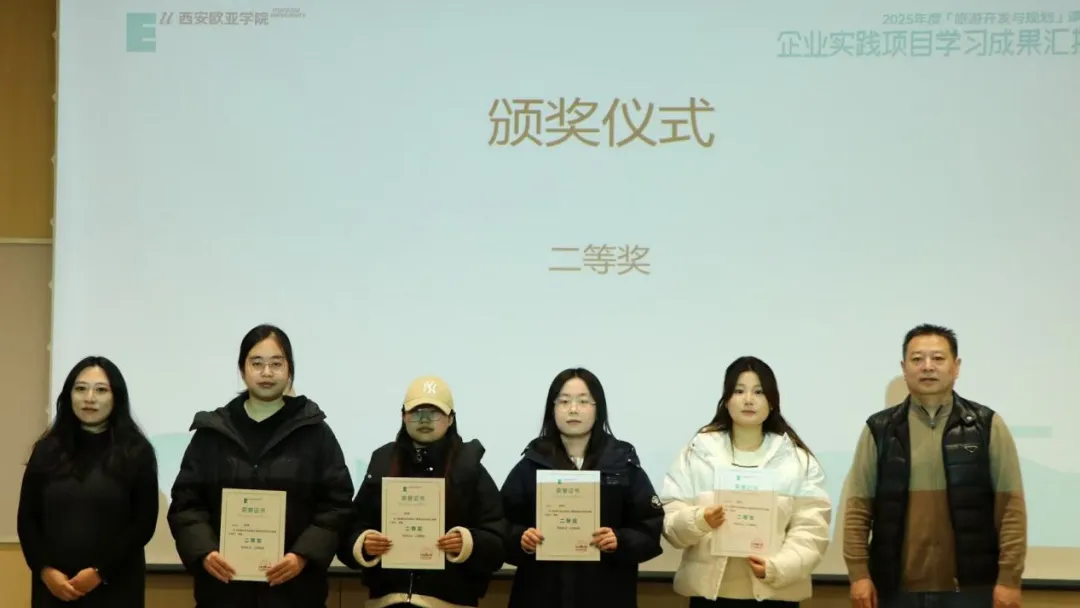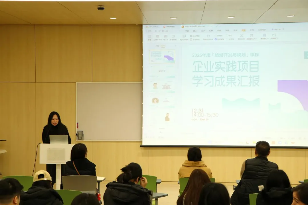 2025年12月31日,2025年度《旅游开发与规划》课程企业实践项目学习成果汇报在北A120举行。宽喜堂旅游开发有限公司总经理马德永、中联西北工程设计研究院有限公司华建公司总经理助理闫峭、西安欧亚学院工商管理学院院长助理陈唯静、旅游开发与规划课程负责人韩洁、教师姜楠莅临现场,共同听取学生汇报并开展评价验收。