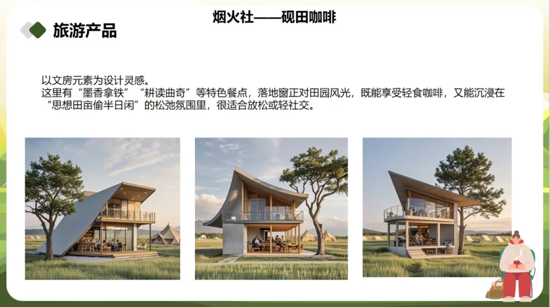 项目秉持“知行合一”的理念,融合晏阳初乡建智慧与翟城农耕文明,打造“文化研学+田园实践”沉浸式体验区,设计时空场记、砚田咖啡、砚池云影、暮光市集等特色项目,构建可游、可学、可居的乡村文旅目的地。
