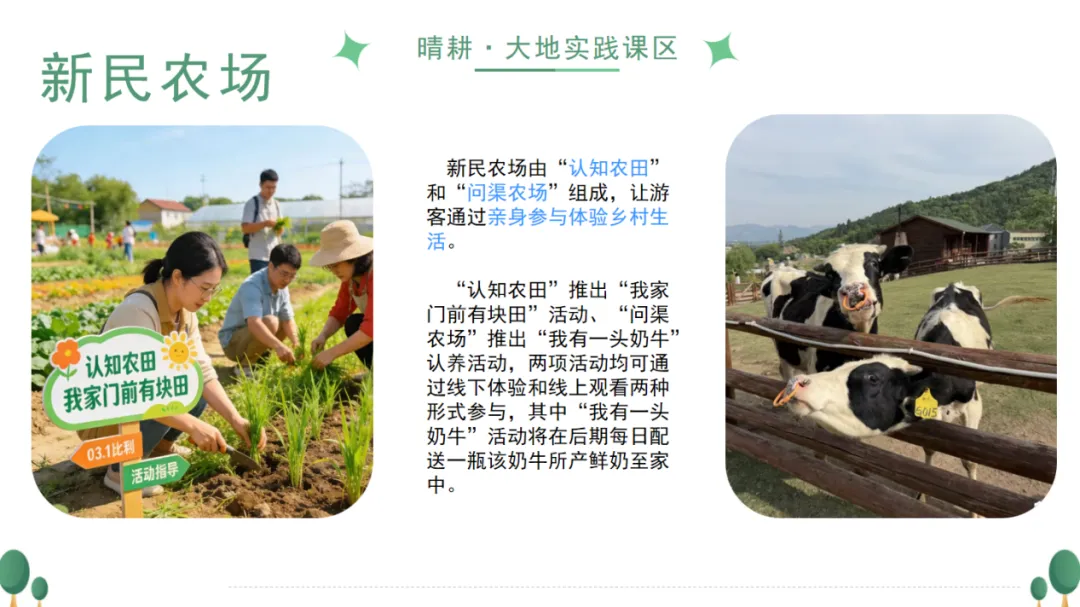 围绕“平民教育亲子实践村”定位,将晏阳初的四大教育理念转化为“晴耕·大地实践课区”与“雨读·人文滋养课区”,推出农田认养、非遗手作、文化剧本游等体验项目,打造“耕读传家”式的亲子研学标杆。