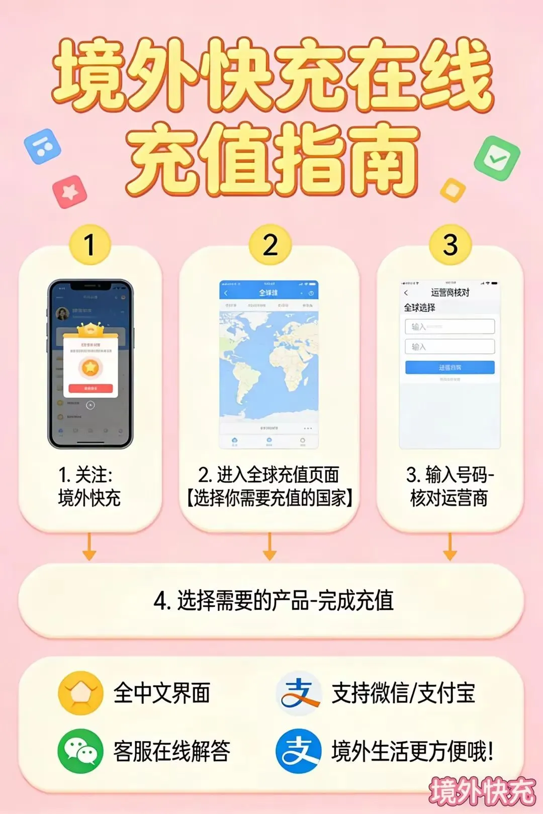 境外快充提供全球100+国家及地区手机话费流量充值服务平台,支持500多家运营商。为在海外的中国人提供最优质的24小时线上充值服务