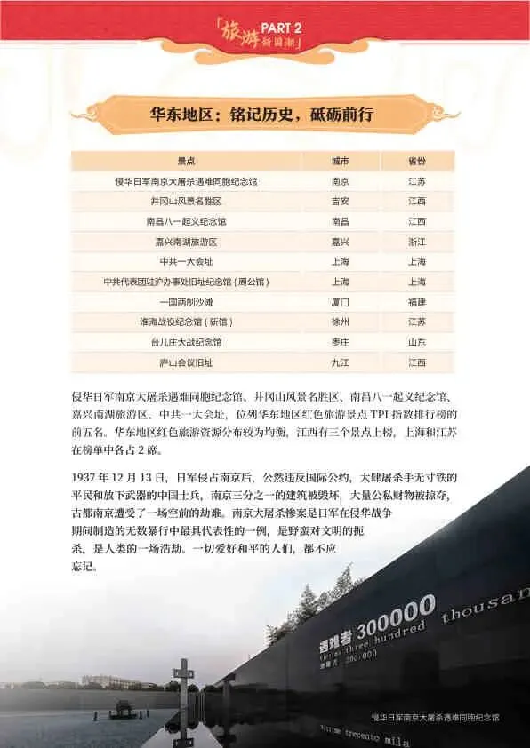 - 景点: 侵华日军南京大屠杀遇难同胞纪念馆、北大红楼、上海四行仓库抗战纪念馆等。