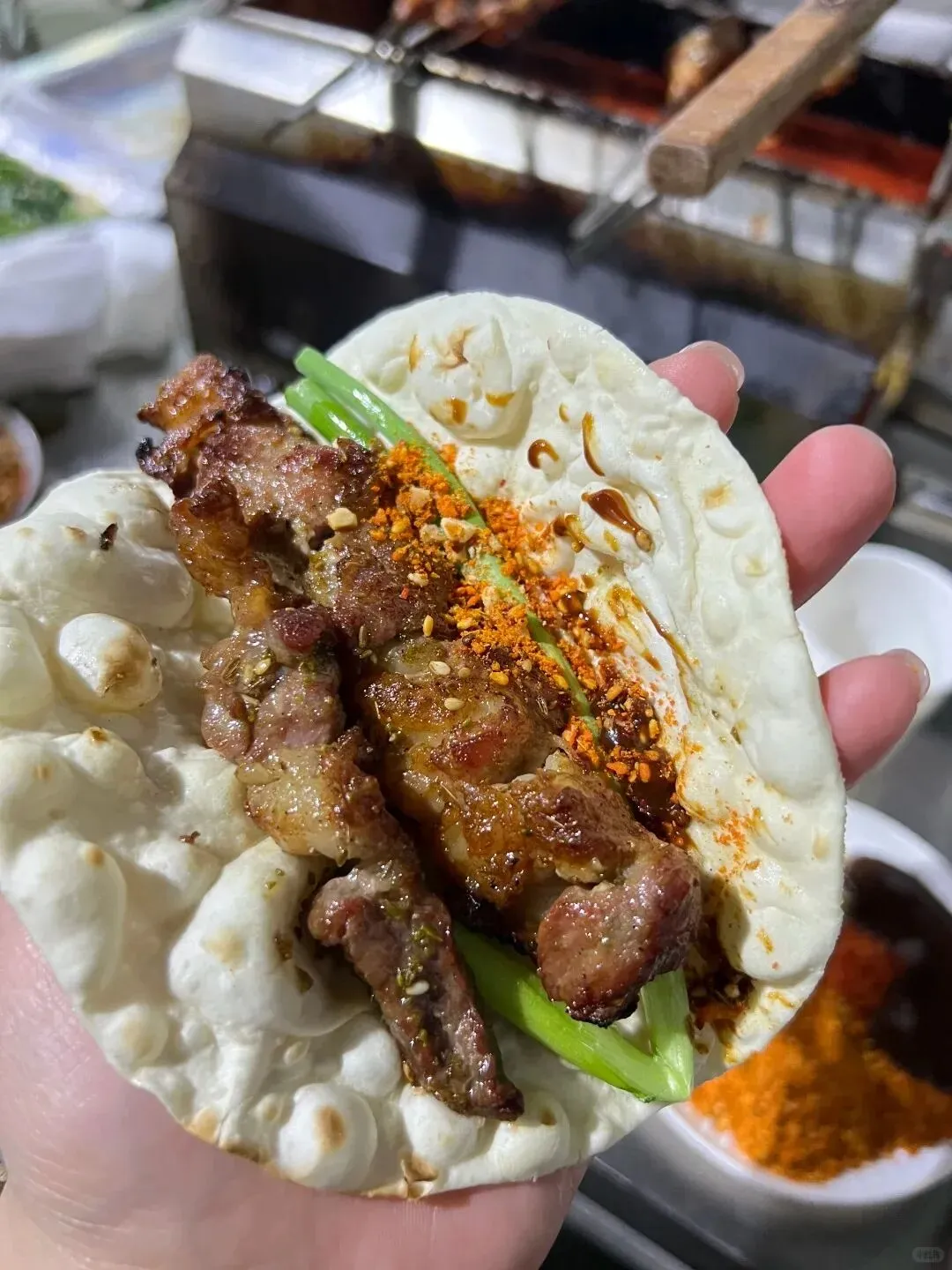 淄博烧烤:小饼卷肉配小葱,炭火烤制的肉串滋滋冒油,仪式感拉满,一口解锁山东的烟火气;