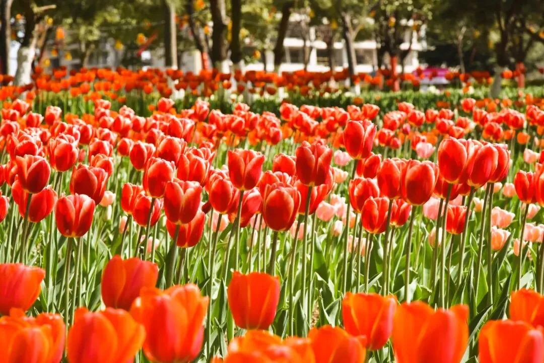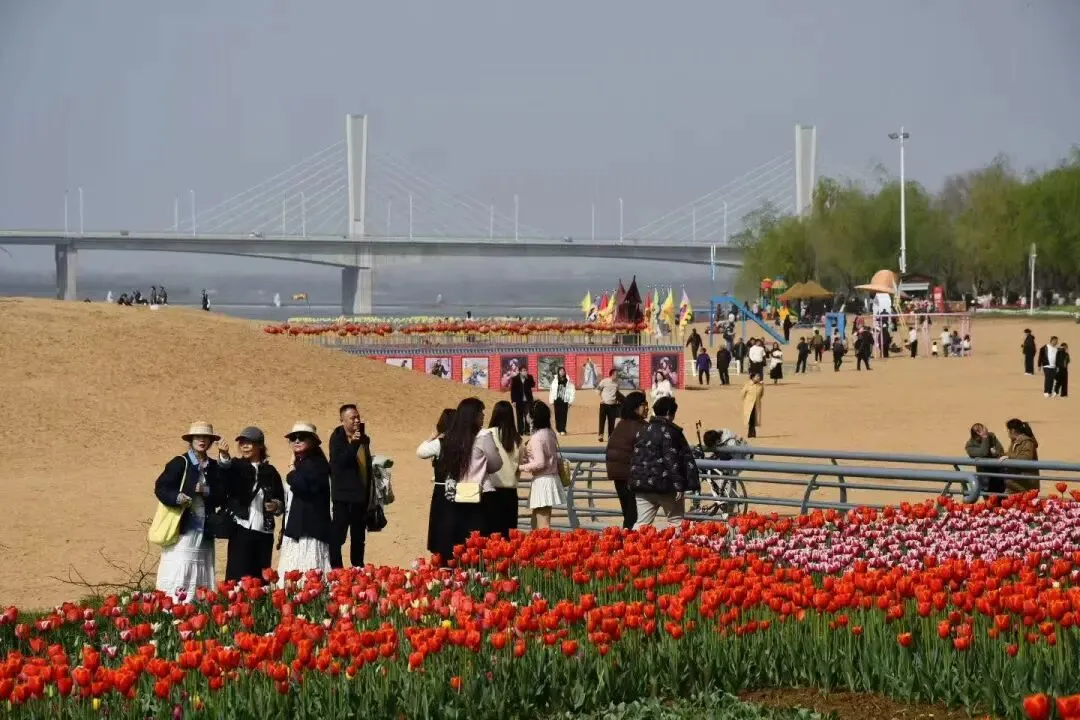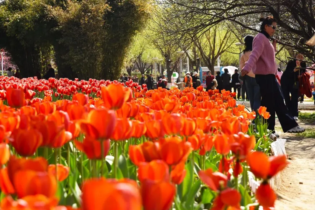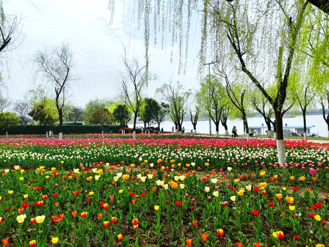 白河滩公园的春日灵魂,当属这片震撼人心的郁金香花海,也是入园首选打卡点。园区内120万余株郁金香竞相绽放,覆盖近6万平方米区域,汇聚“紫衣王子”“水晶星”等百余种品种,红、粉、紫、黄等色彩交织,以色块和飘带为基底勾勒出“光芒四射”“心形”等灵动图案,与粼粼白河碧波、岸边垂柳交相辉映,随手一拍都是氛围感大片。