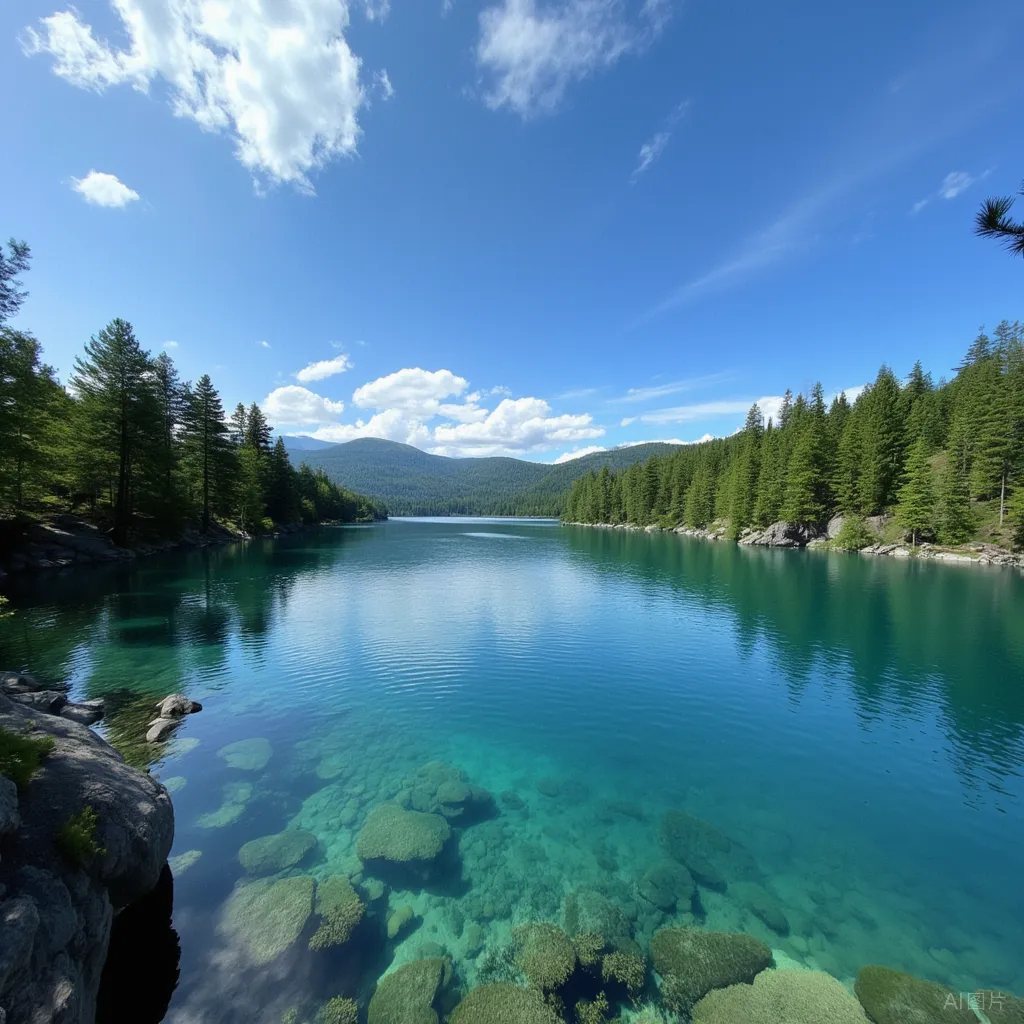 碧水蜿蜒,湖光变幻,木屋散落