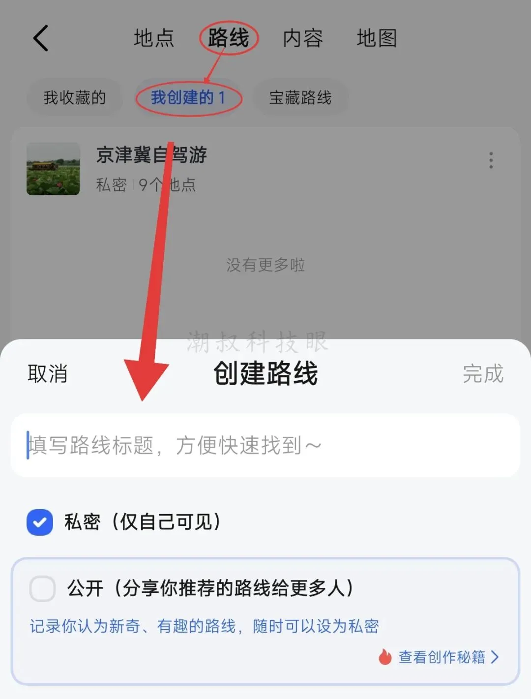 4、通过上图可以看到,路线默认为私密,你也可根据个人喜好设置为公开。 5、点击完成进入创建页面,依次添加自己收藏的地点,可以直接按顺序添加,也可以后期修改顺序,可以一次性添加,也可以后续补充(参照图4)。