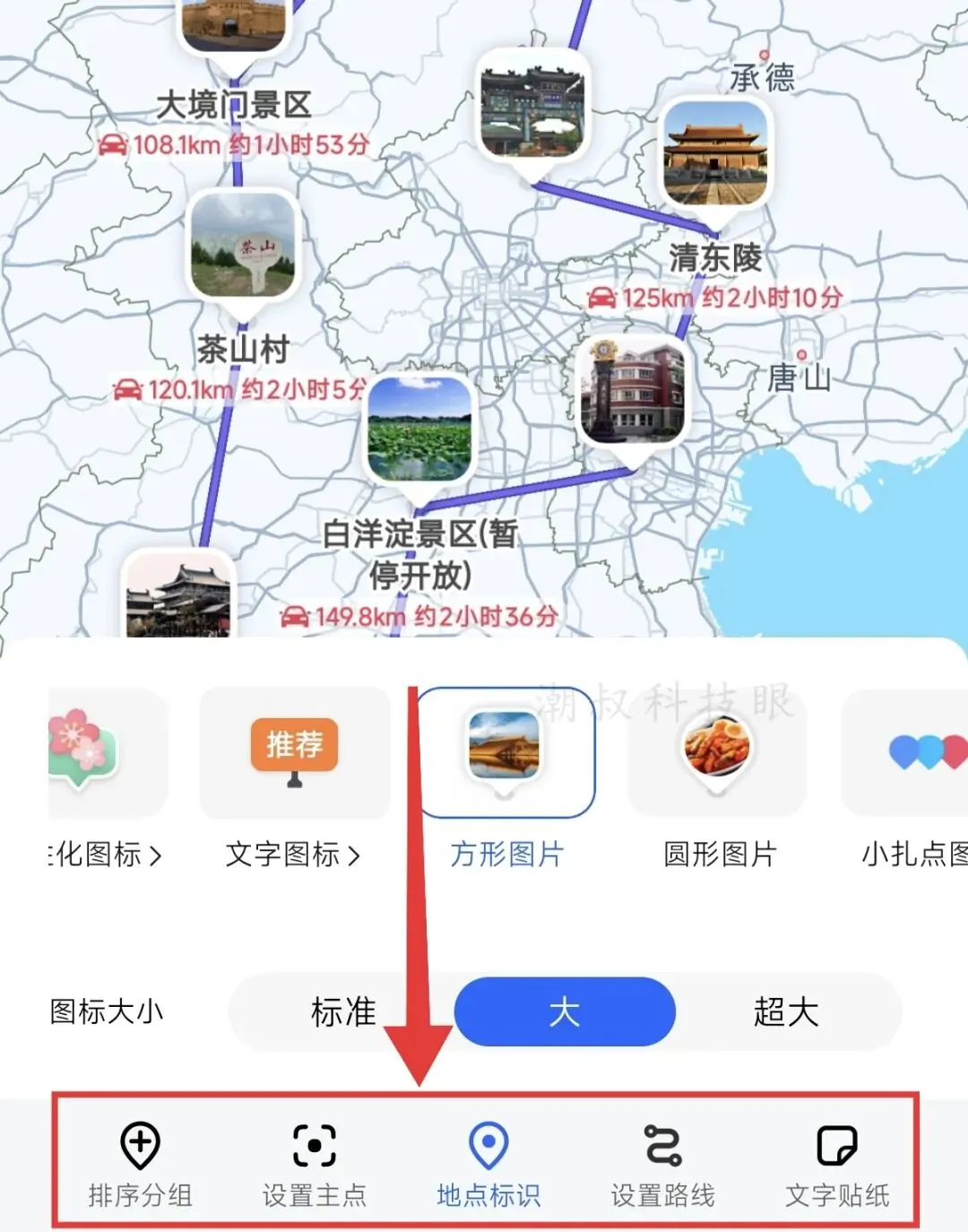 图5 如图5所示,点击底部工具栏中间的按钮,进行地点图标美化,可选的图标很多,推荐选「方形图片」。此外,支持调节图标大小! 2、设置主点:可理解为你的大本营,也就是从这里出发,因为并不是所有旅游路线都是闭合环线,举个栗子,你从广州飞到北京,把北京设为主点(大本营),分别从北京去天津、去承德、去张家口、去石家庄……等于从一个点向外辐射,如图6所示。