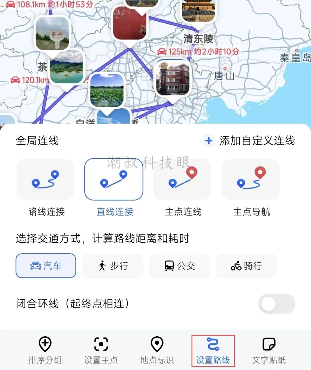 图7 4、调整连接线:每个地点之间的连线样式,可在「设置路线」选项里调整,如图8所示,可选实际路线、直线、主点连线和主点导航四种,还能自定义连线。 与此同时,交通工具可选:汽车、步行、公交和骑行,支持闭合环线(起点终点连起来)。