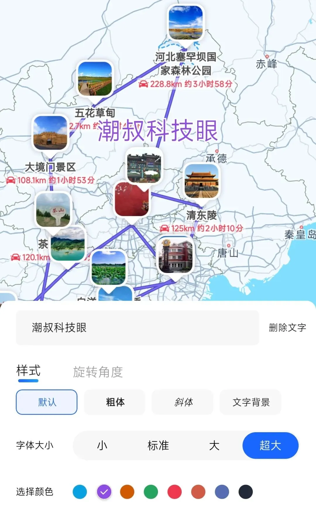图8 5、添加文字贴纸:想在路书上添加文字?可以点击「文字贴纸」选项,见图6底部工具栏最右侧图标。