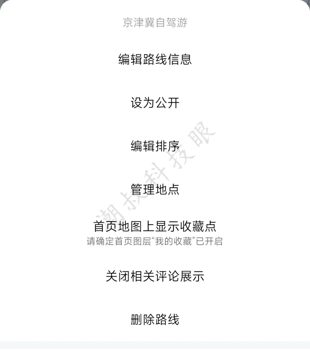 图11 3、关闭收藏点:制作路书会收藏很多地点,打开高德地图后首页会看到很多星星⭐️,如果你强迫症,可以通过图10「首页地图显示收藏点」关掉,当然也能再次开启。 4、评论不再展示:在图10最后一项能够看到,直接点击就能关闭和开启! 六、路书制作总结 说到这里,整个教程就结束了,大家能够看出,高德制作路书的功能非常强大,并且完全免费,没有广告也不需要VIP,赶紧用起来吧! 最后,如果你还有不懂的,可以在评论区留言给我。另外,由于能力所限,错误之处在所难免,敬请谅解! -END-