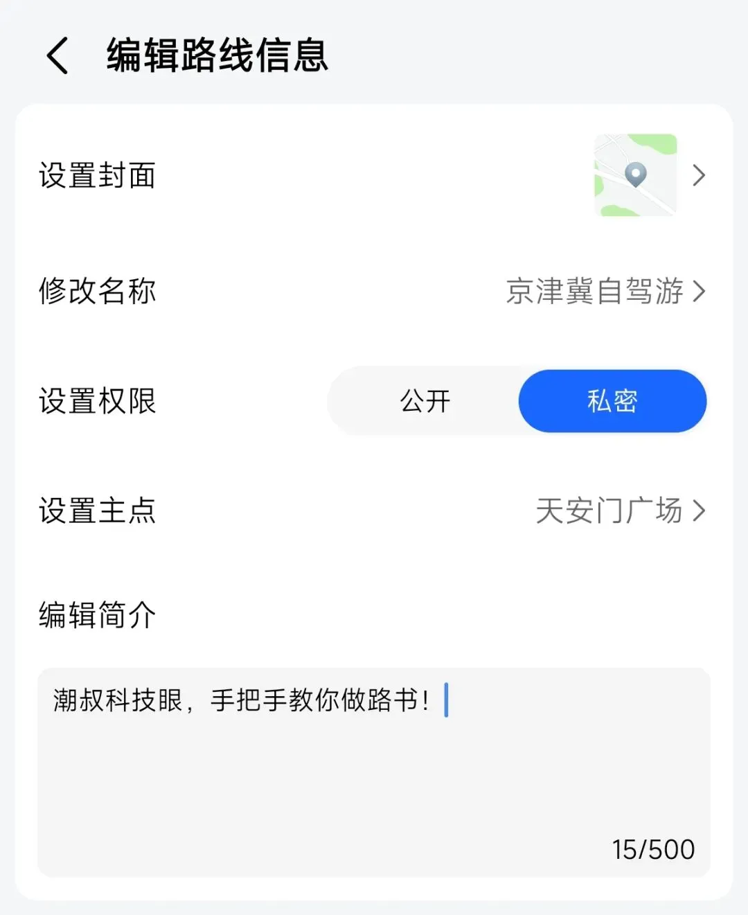 图10 1、权限设置:路书制作完成后,可设置公开/私密权限。私密权限仅自己查看使用,适合个人行程;公开权限可让其他网友查看,适合分享旅行攻略。 2、信息设置:通过「编辑路线信息」,可以设置路书封面、修改路线名称、和编辑简介。此外,咱们之前提到的设置权限和设置主点也能在图11中看到。