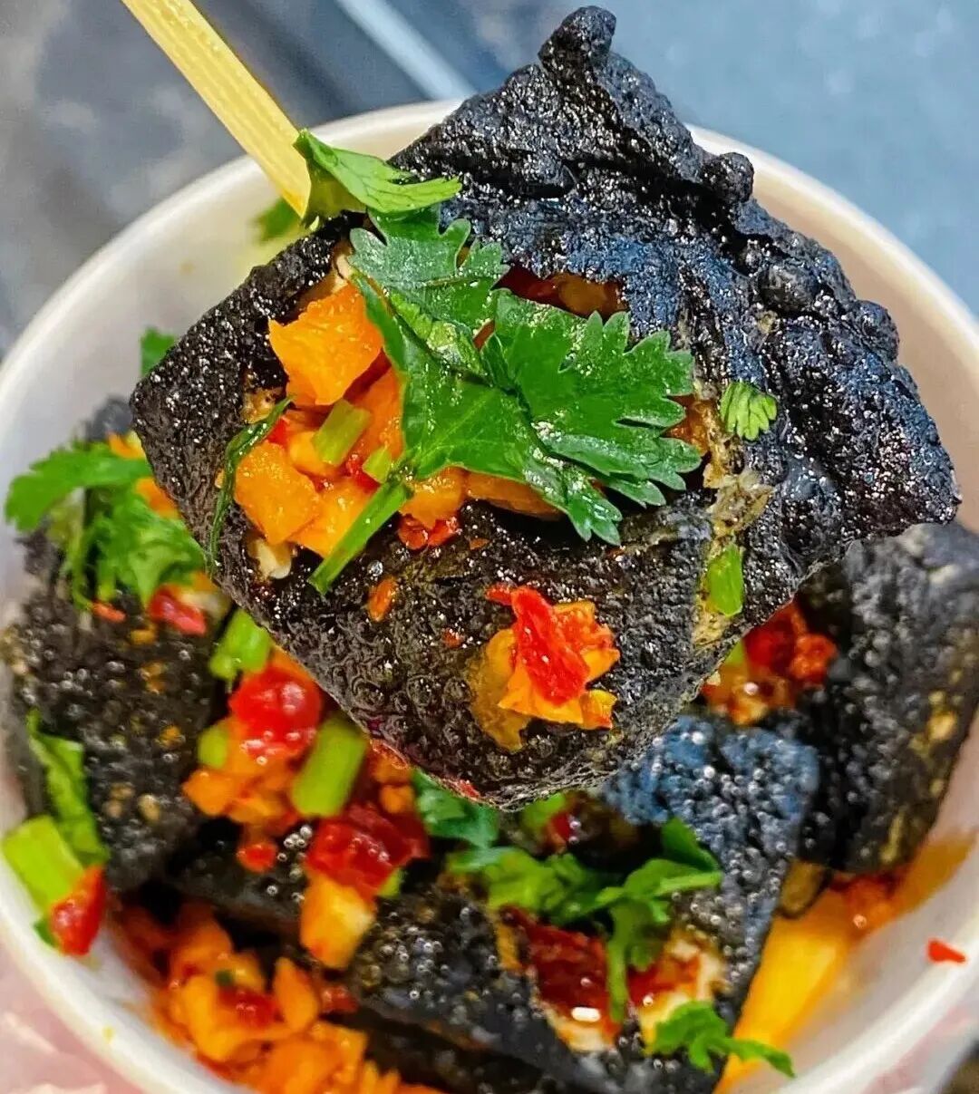 5. 株洲臭豆腐 在株洲的街头巷尾,总能看到围着臭豆腐摊的小桌。这里的臭豆腐选用优质黄豆和特制卤水发酵,油炸至金黄酥脆。用竹签划开,刷上特制的辣椒酱、蒜蓉水和香菜,外皮酥脆得"咔嚓"作响,内里却嫩滑如脑,混合着浓郁的卤香和辣香,一口入魂。