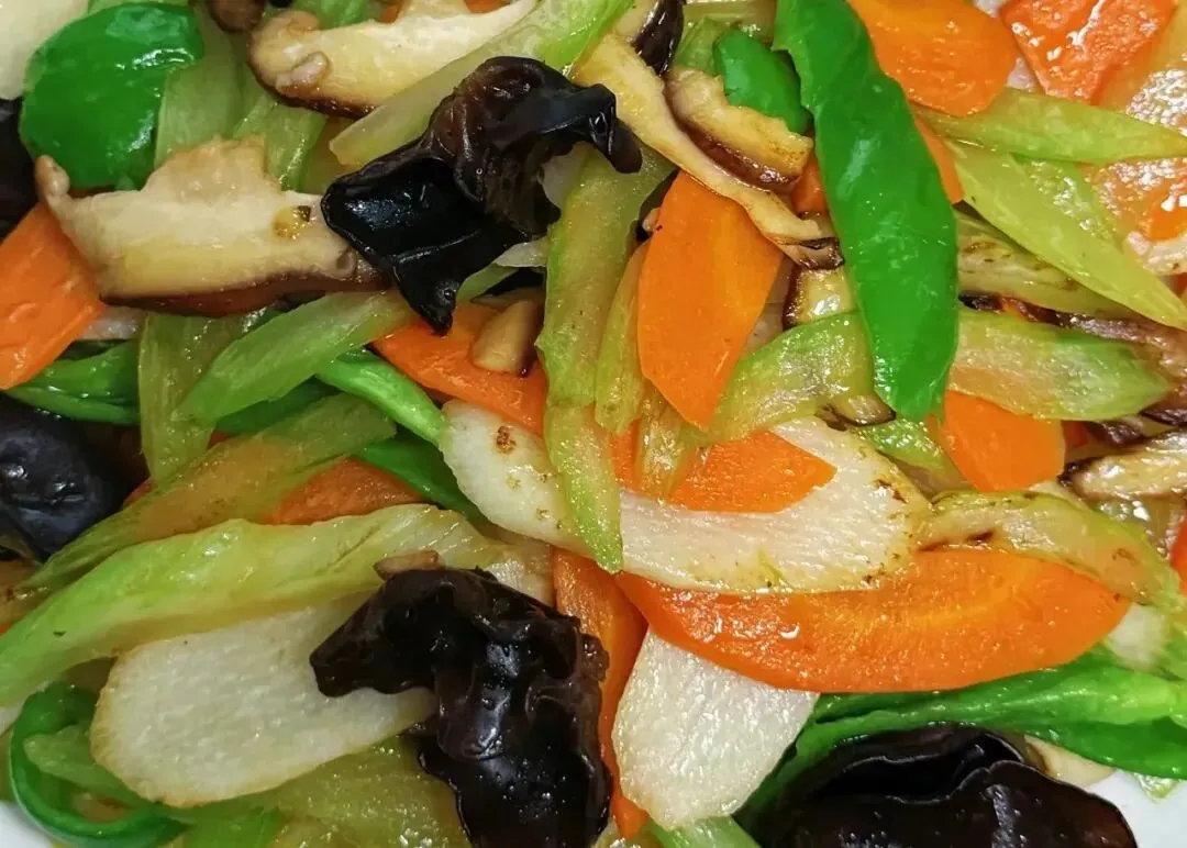 10. 株洲什锦菜 这是株洲宴席上常见的"开门菜"。将胡萝卜、木耳、豆干、腐竹、青豆等多种食材切丁,一同下锅炒制。虽然是一道素菜,但讲究火候与调味,口感丰富,色彩斑斓,酸甜咸鲜兼具,既解腻又开胃,展现了湘菜在素菜制作上的巧思。