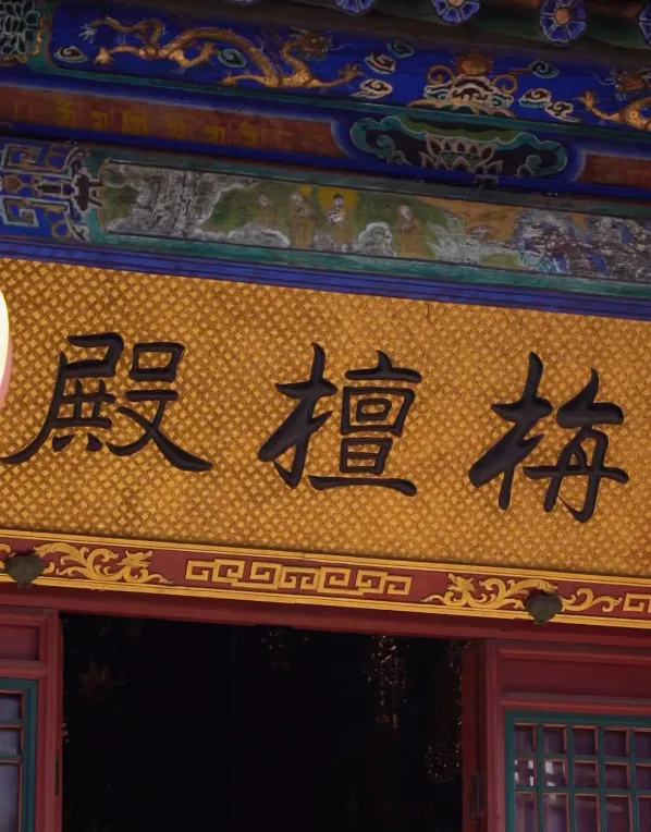旃檀殿是黛螺顶中轴线上的第二重大殿。该殿建筑很有特点,殿座为六角形台基,故殿体也呈六角形建筑。殿顶为六角重檐攒尖顶,这种样式在五台山寺院中可谓别具一格。