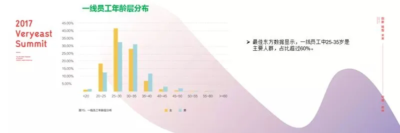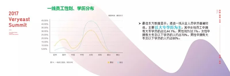 酒店一线岗位男女比例已经逐渐趋于平衡,大专及以下学历占总人数的70%。换言之,旅游服务业从业人员的学习力还有待大幅提升。