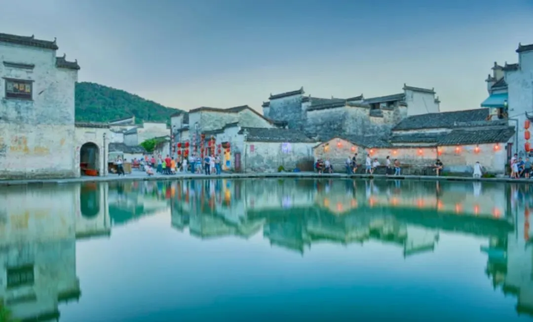 村中心半月形池塘,四周环绕徽派老宅与汪氏宗祠(乐叙堂),傍晚灯笼亮起时氛围感拉满。