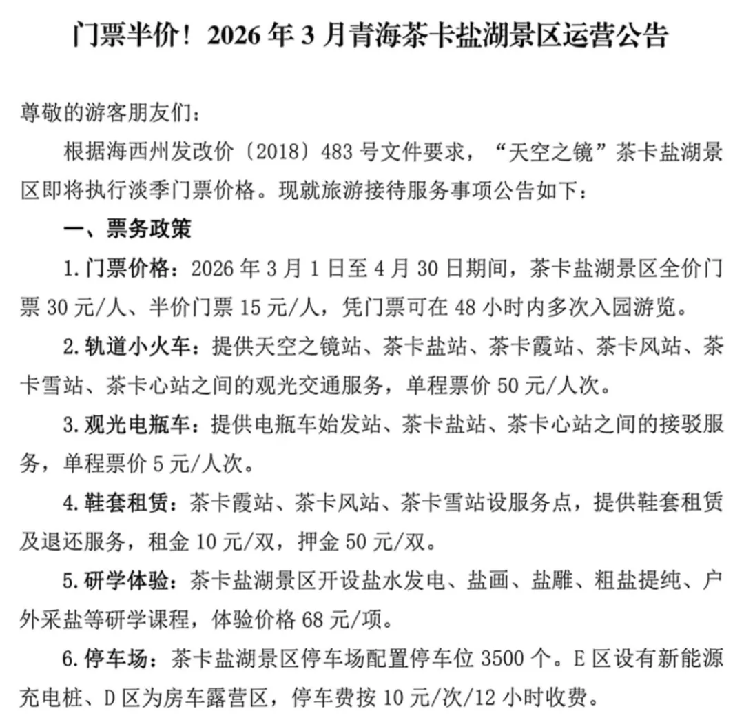 茶卡盐湖景区:3月1日至4月30日期间,景区全价门票30元/人、半价门票15元/人,凭门票可在48小时内多次入园游览。