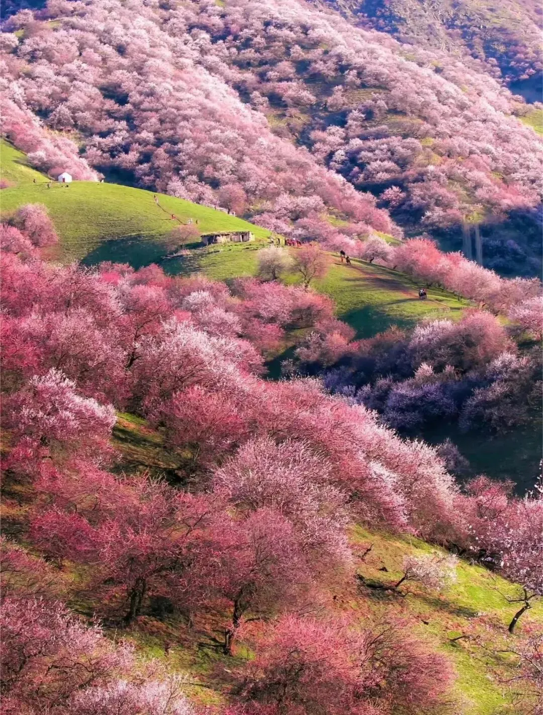 新疆伊犁吐尔根杏花沟(4月上旬):漫山遍野的野杏花,在草原与雪山映衬下,宛如中世纪油画。