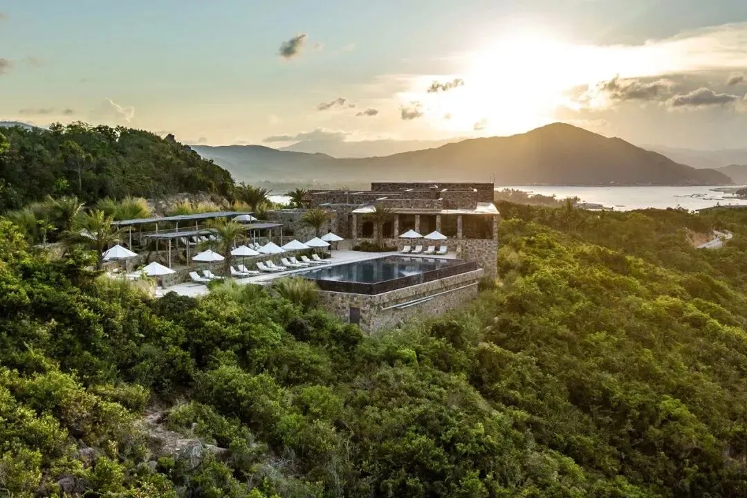 木质的百叶框架和栏杆柔化了建筑石材幕墙硬朗的线条,让建筑在植被的环绕中毫不突兀。建筑和景观倒映在客房和公共区域通高的落地玻璃门窗和如镜面般平静的水池中,让空间的层次愈加丰富。