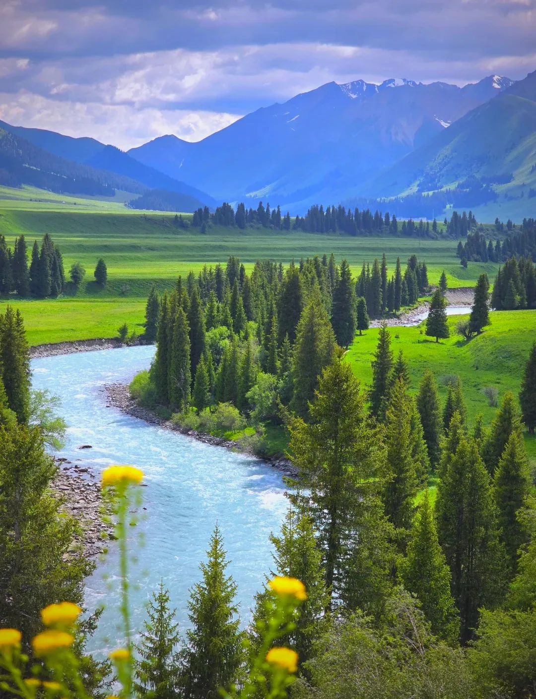 喀拉峻草原意为 “苍苍莽莽的草原”,四月草木初生,雪山相依,森林、峡谷、草甸错落分布,气候凉爽,风光清幽,有着不输瑞士的纯净与治愈。