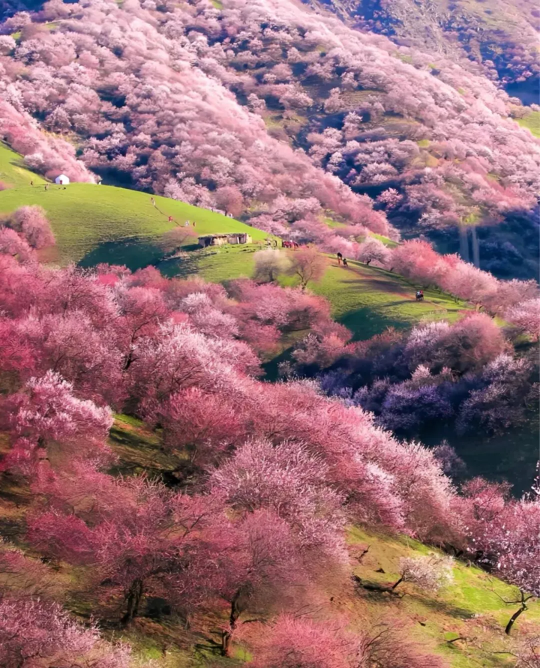 杏花随处可见,可伊犁的野杏花,永远是无可替代的那一抹惊艳。吐尔根杏花沟绵延数十公里,万亩野杏树次第绽放,粉白的花瓣洒满山坡河谷,如同一场温柔的 “粉色飘雪”。远处雪山巍峨,脚下草甸泛绿,毡房散落其间,牧民策马而过,构成一幅绝美的塞外春色图。