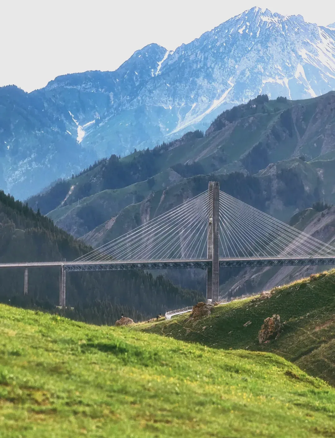 果子沟大桥是新疆公路的地标之作,作为新疆首座公路钢桁梁斜拉桥,横跨山谷,气势恢宏,与周边山林风光相映,既是交通奇迹,也是一道风景线。