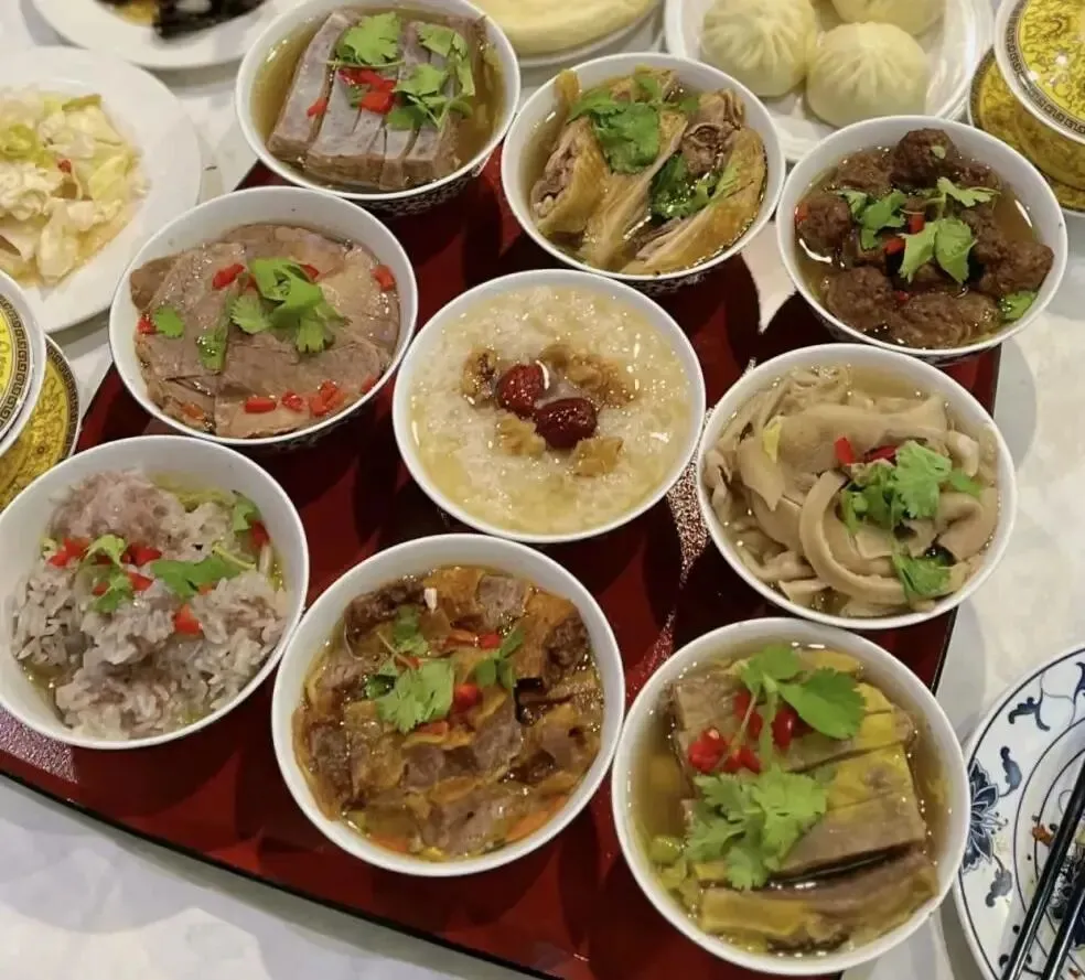 九碗三行子:回族经典宴席菜,九碗菜方正摆盘,荤素搭配,寓意圆满。