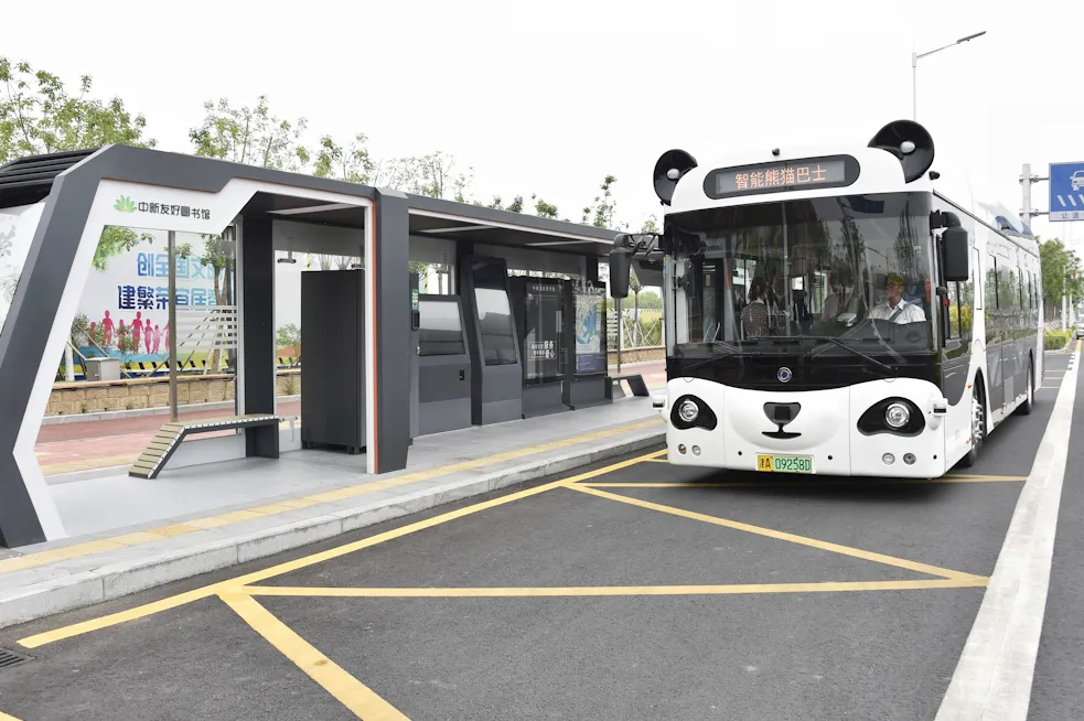 参观完中新友好图书馆后,让我们搭乘“熊猫”智能公交车,亲身体验“无人驾驶”这一未来生活场景。