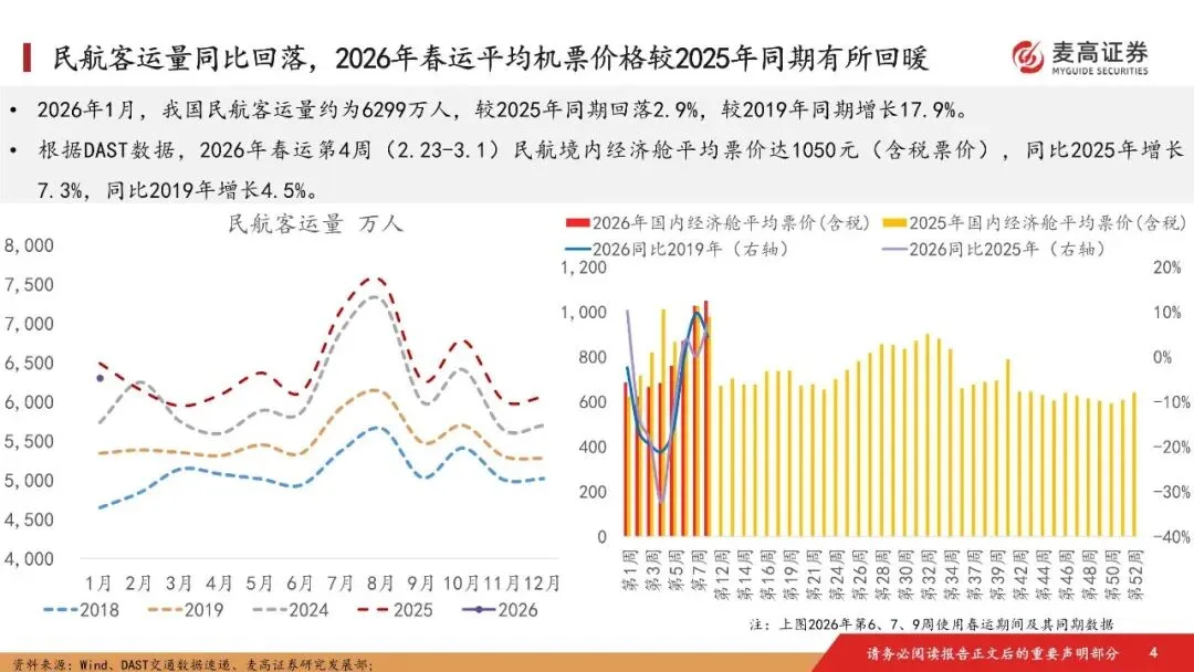 根据DAST数据,2026年春运第4周(2.23-3.1)民航境内经济舱平均票价达1050元(含税票价),同比2025年增长7.3%,同比2019年增长4.5%。