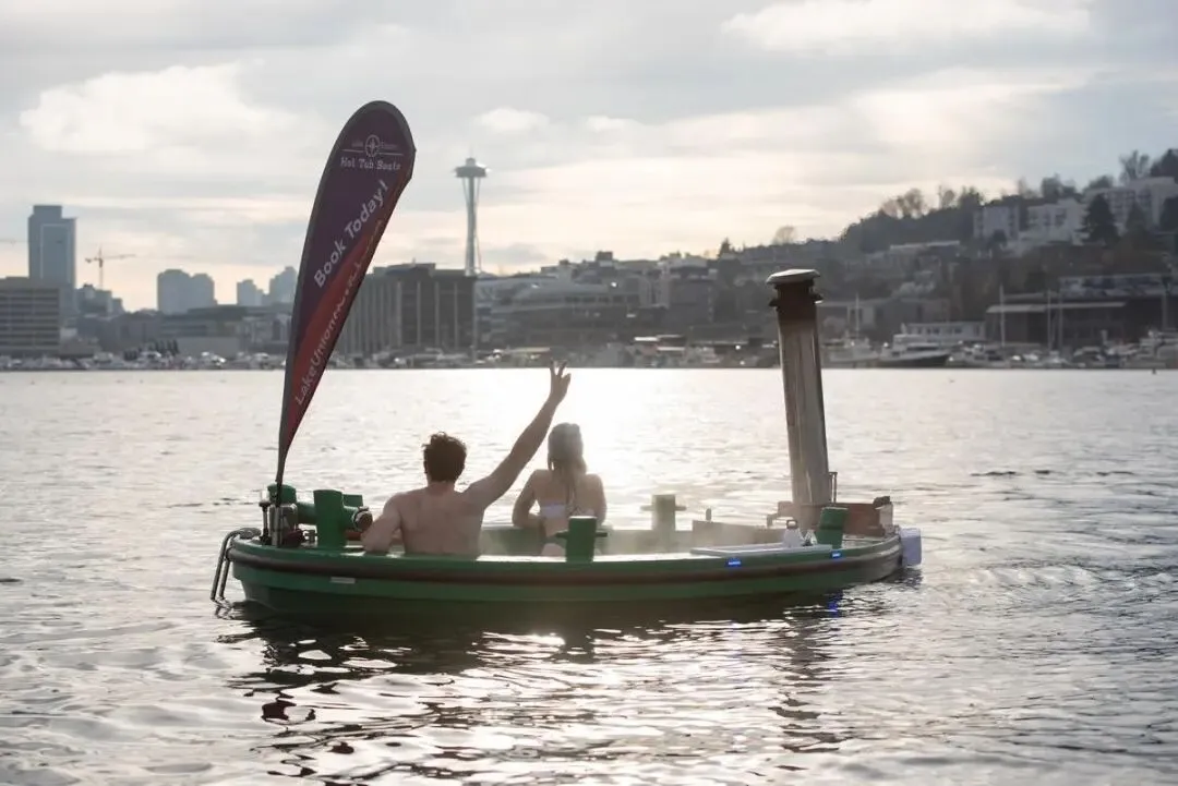 清晨前往联合湖(Lake Union),开启活力满满的一天。从市中心搭乘前往北门(Northgate)方向的40路公交车,在Westlake Ave N站下车即可。你可以在Hot Tub Boats租一艘热水浴缸船,泛舟湖上,航行时不妨留意附近《西雅图夜未眠》里的经典船屋哦。如果更想体验桑拿船,可换乘开往大学区方向的70路公交车,前往湖对岸的Wild Haus租赁。