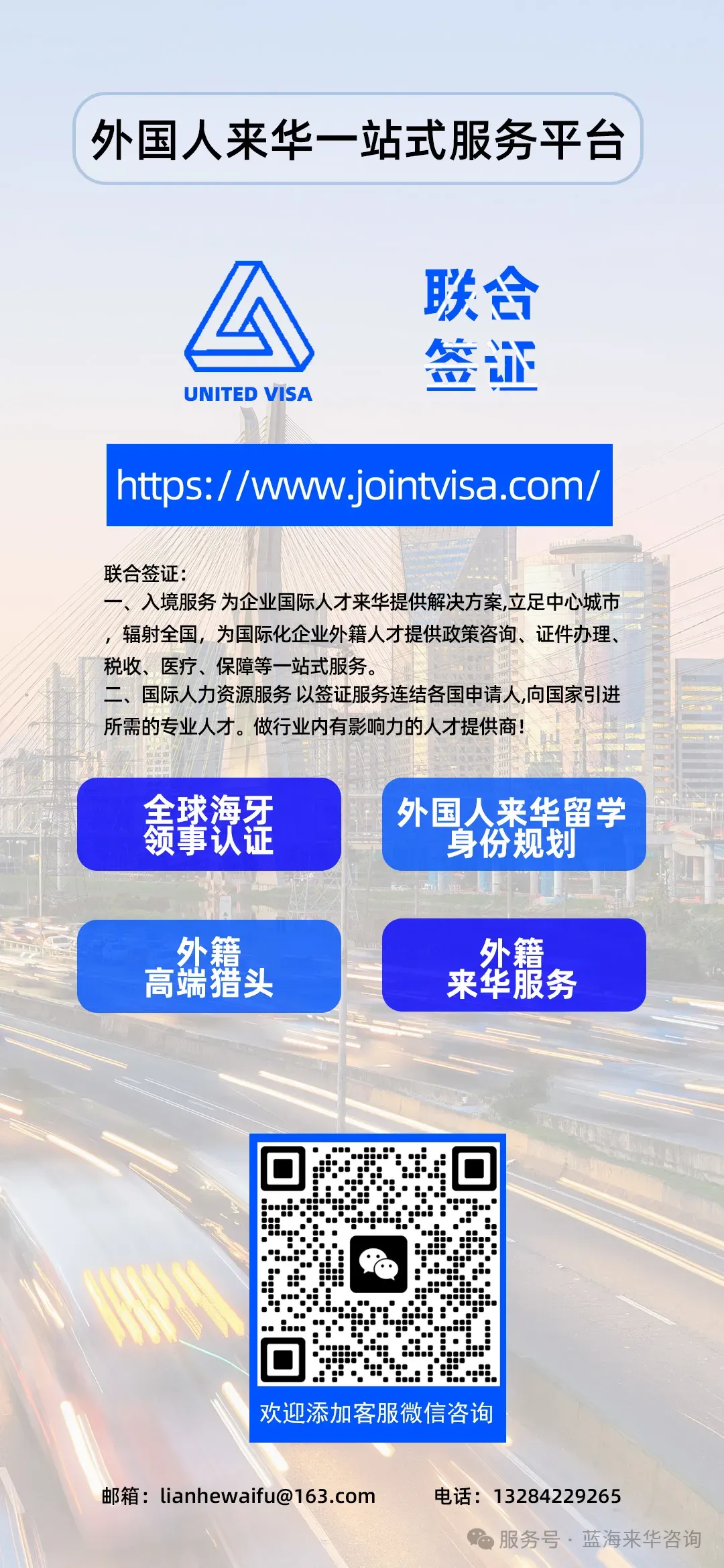 Foreign-related affairs are complex, and every link—from talent recruitment to visa application, from document authentication to legal rights protection—requires professional support. With diverse businesses as the foundation and professional services as the guarantee, JOINT VISA can not only provide "one-stop" solutions for international talent and compliance management to multinational enterprises but also offer careful and comprehensive full-chain support for individuals' cross-border affairs. Choosing us means choosing a "worry-free, efficient, and compliant" cross-border service experience, ensuring every cross-border cooperation and affair handling is successful and free from worries.